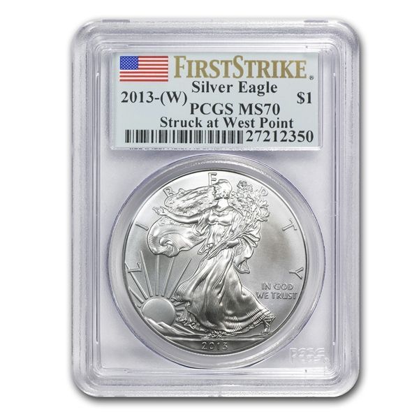 VDG**74200Year**2013MintMark**N/AGrade**MS-70Denomination**1Diameter**40.6mmThickness**2.98mmInnerPack**N/AOuterPack**N/ARemarks**Graded a perfect MS-70 First Strike by PCGS and containing 1 troy ounce of .999 fine Silver, this 2013 (W) American Sil