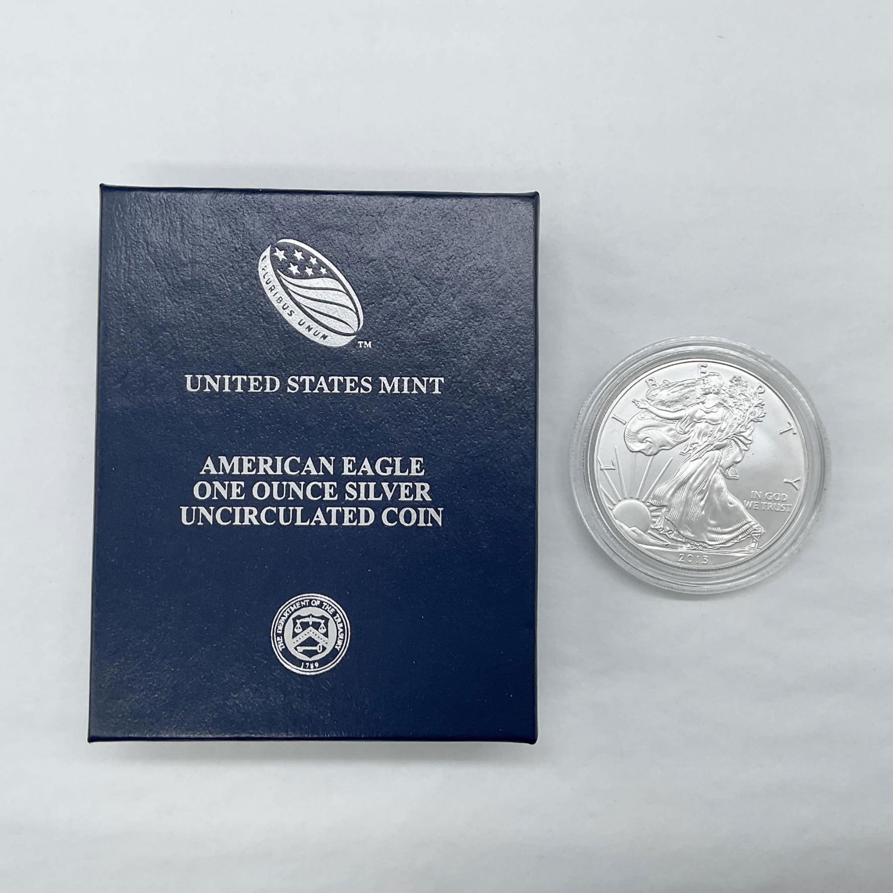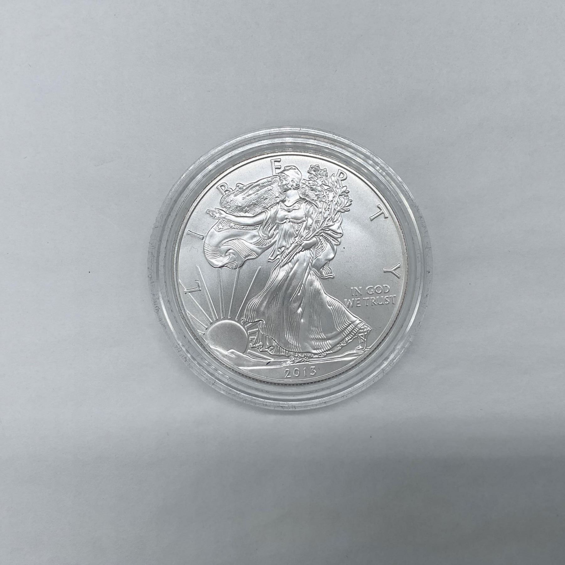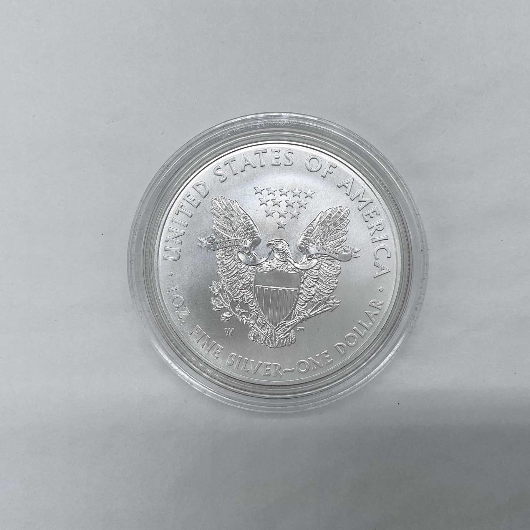 West Point Mint. 1 ounce. The obverse side depicts Liberty in full stride. She is shown wrapped in the flag, her right hand is extended and her left arm is carrying laurel and oak branches. The reverse side features the heraldic eagle clutching an olive branch and arrows. The coin is in a protective case. The case is approximately: 0.25"D x 2" dia. This item has its original box: 3.75"L x 3"W x 1"H.