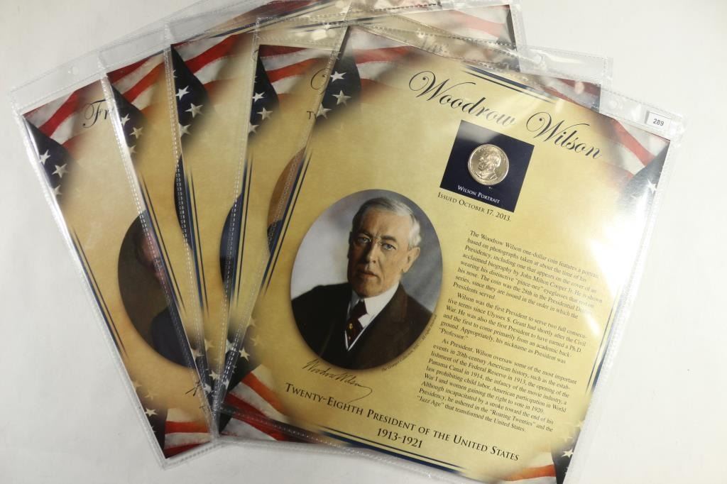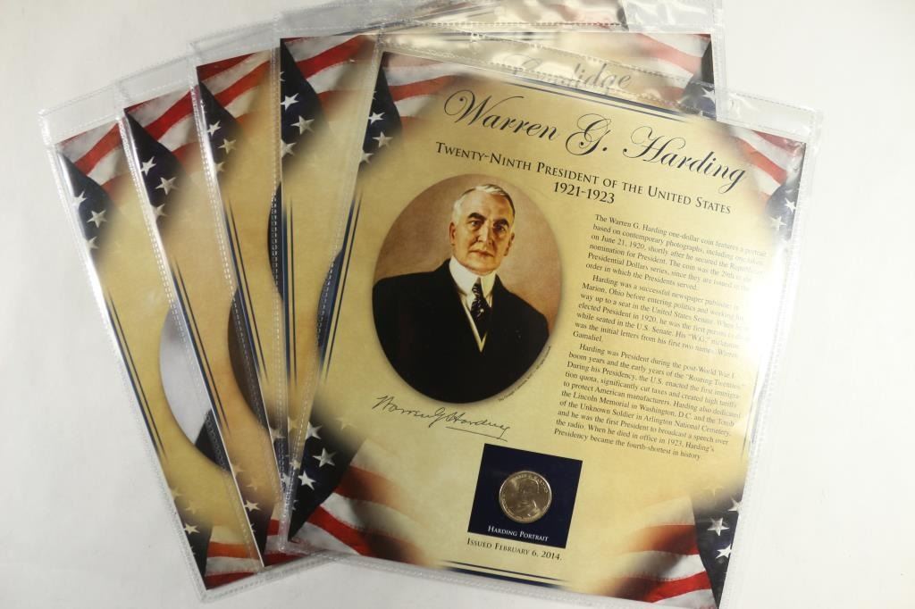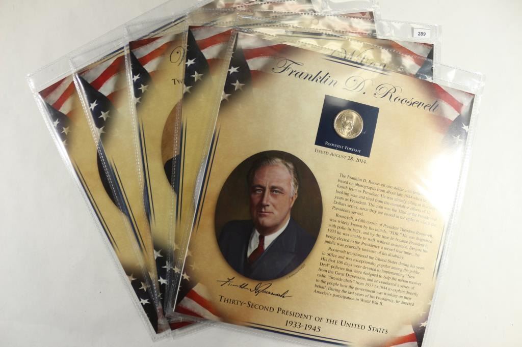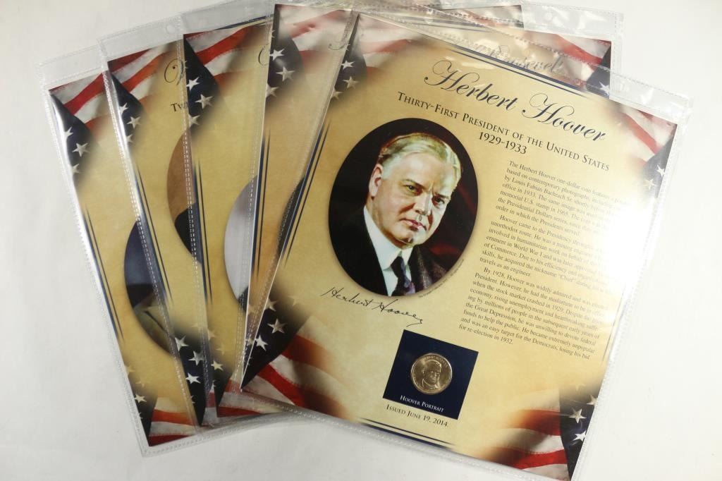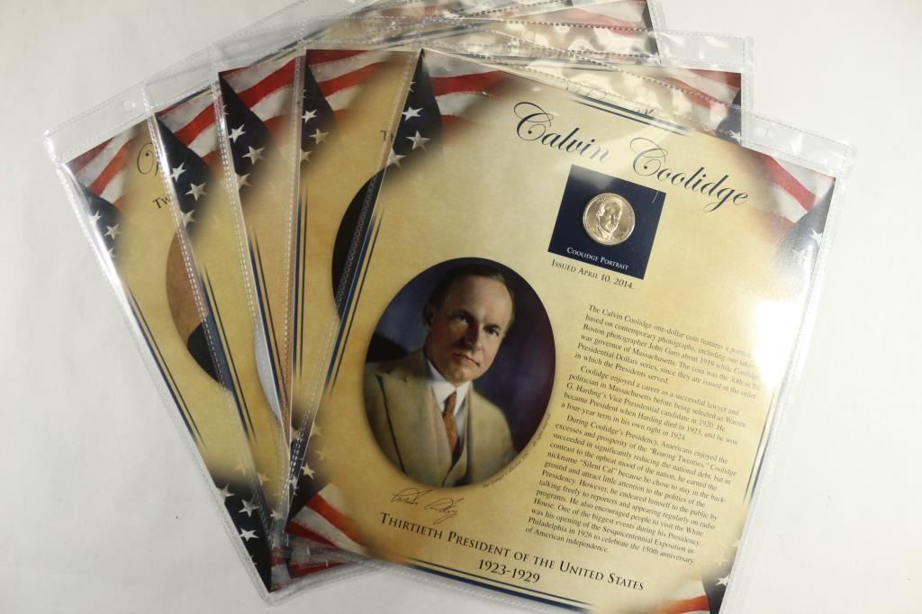 2014 CALVIN COOLIDGE, 2014 HERBERT HOOVER AND 2014 FRANKLIN D. ROOSEVELT PRESIDENTIAL DOLLARS & STAMPS ON ILLUSTRATED CARDS. COINS ALL BRILLIANT UNC AND STAMPS ARE ALL MINT UNUSED