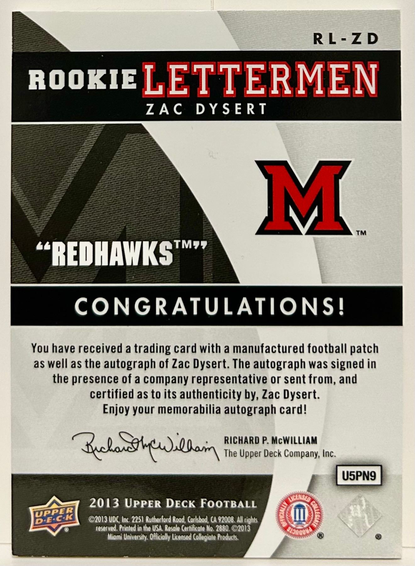2013 Upper Deck Rookie Lettermen Patch Auto #RL-ZD