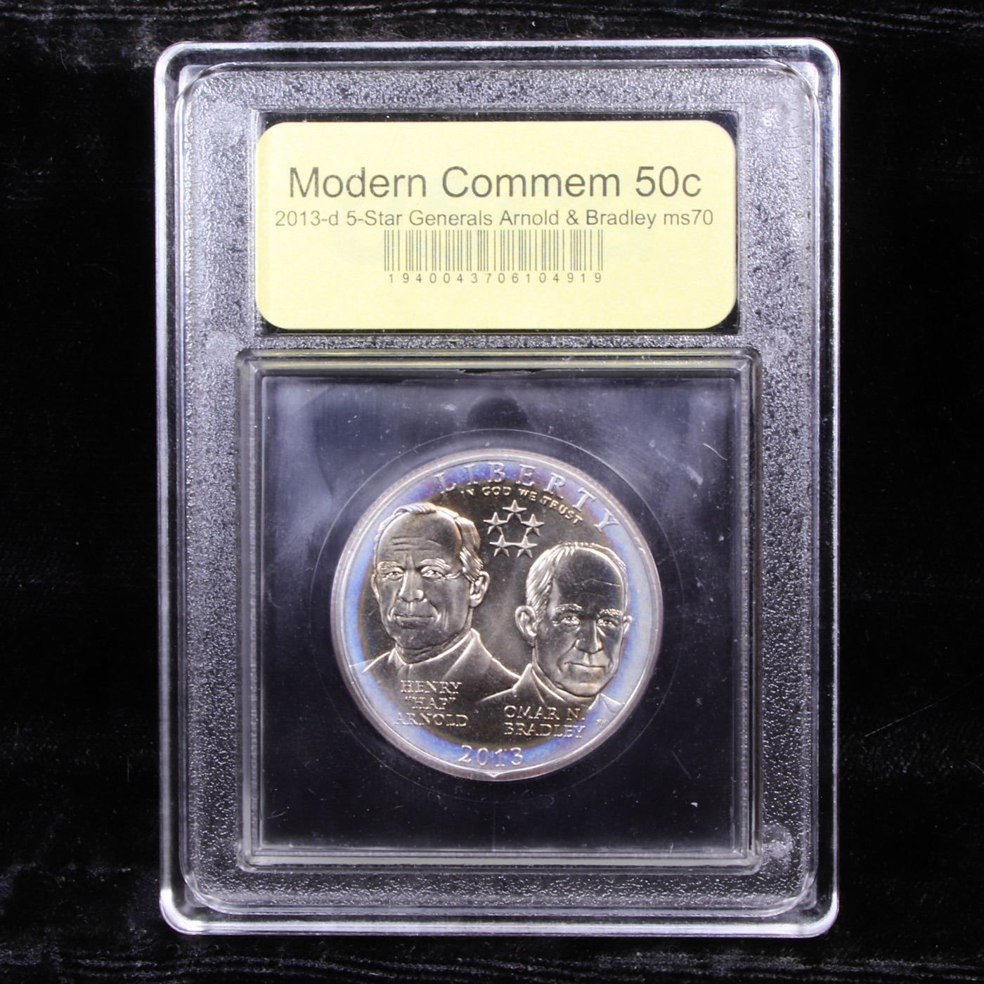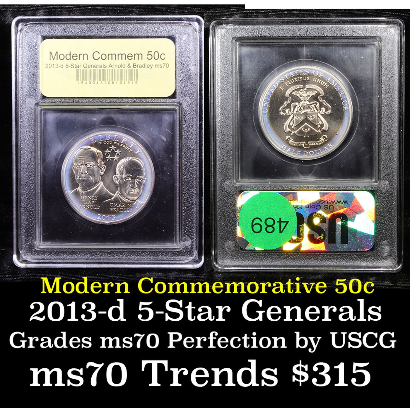 2013-d 5-Star Generals Arnold & Bradley Modern Commem Half Dollar 50c Graded ms70, Perfection By USCG. First time we have had the opportunity to offer this commemorative. The 2013 5-Star Generals uncirculated half Dollar was issued to Celebrate the 132nd anniversary of the founding of the College while honoring the lives and legacies of Generals Henry “Hap” Arnold and Omar Bradley with this 2013 5-Star Generals Proof Clad Half-Dollar. This example is Graded MS70 by USCG.