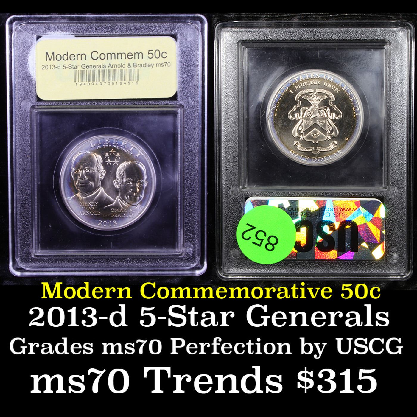 2013-d 5-Star Generals Arnold & Bradley Modern Commem Half Dollar 50c Graded ms70, Perfection By USCG. First time we have had the opportunity to offer this commemorative. The 2013 5-Star Generals uncirculated half Dollar was issued to Celebrate the 132nd anniversary of the founding of the College while honoring the lives and legacies of Generals Henry “Hap” Arnold and Omar Bradley with this 2013 5-Star Generals Proof Clad Half-Dollar.