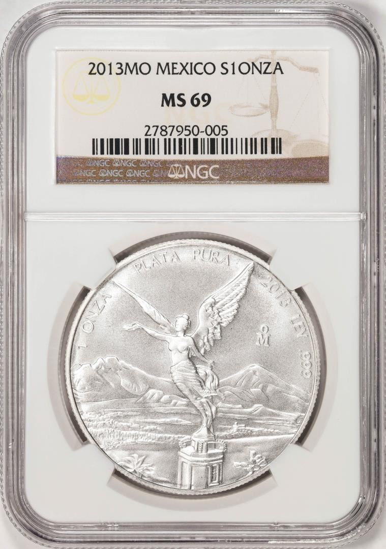 One 2013Mo Mexico 1 Onza Libertad Silver Coin NGC MS69. NGC Certified.