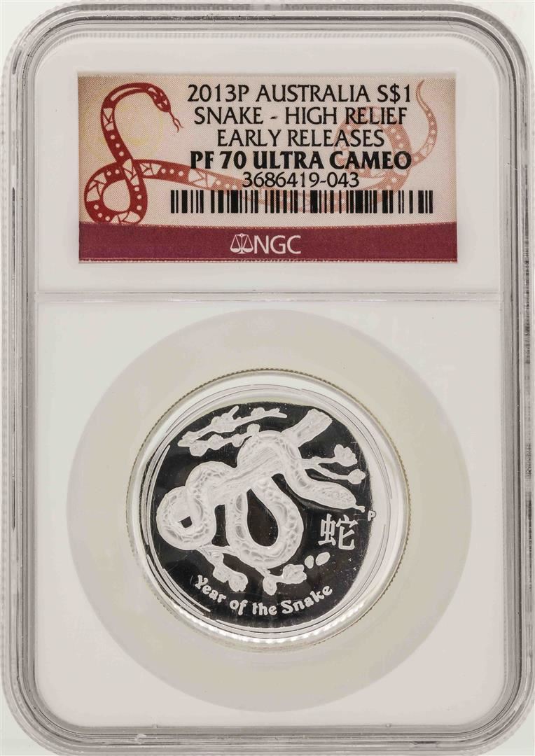One 2013P Australia $1 Snake High Relief Coin NGC PF70 Ultra Cameo. NGC Certified.