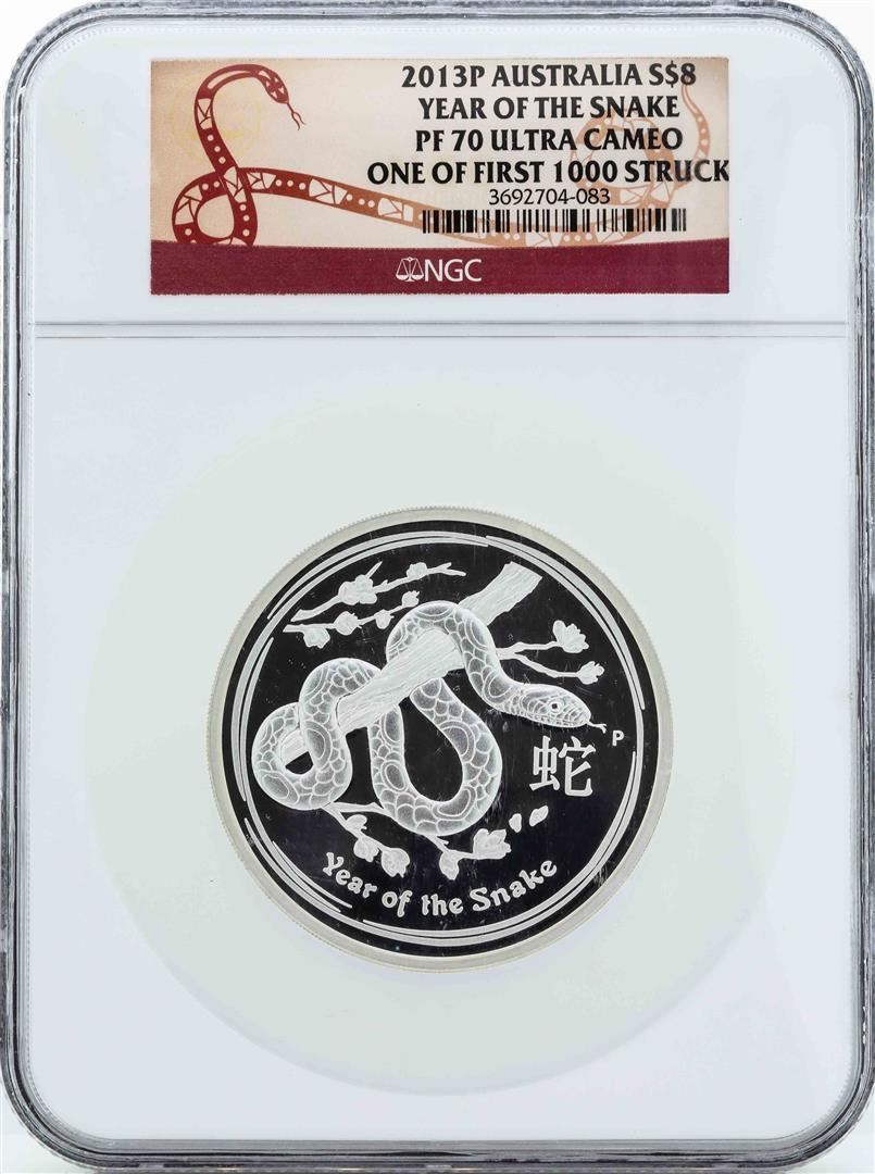 One 2013P Australia $8 Year of the Snake Silver Proof Coin NGC PF70 Ultra Cameo First Strike. NGC Certified.