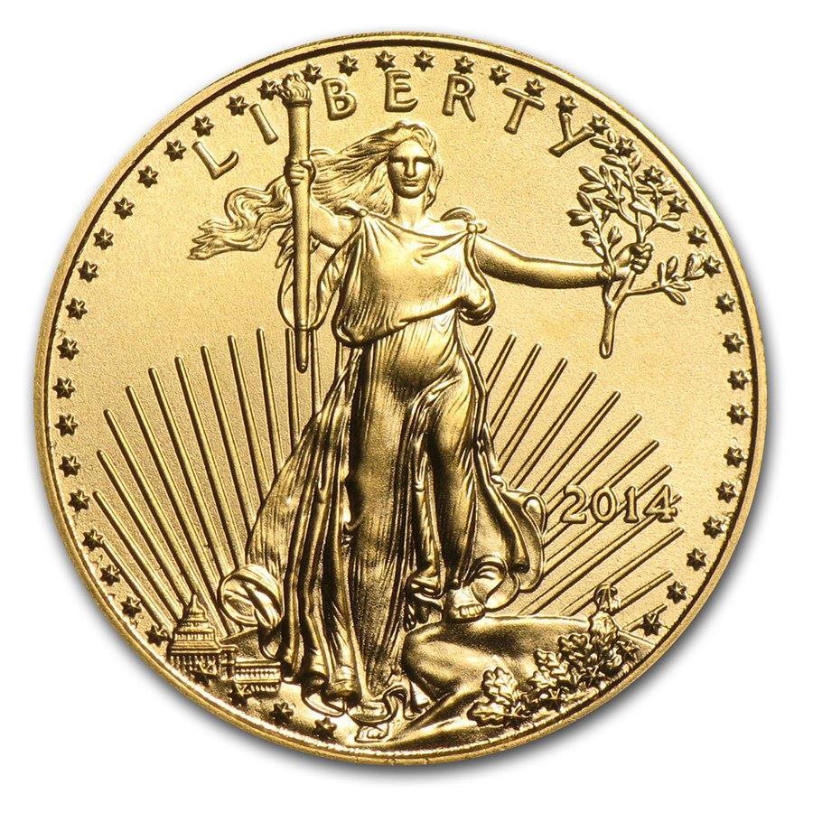 #79044 Year: 2014 Grade: Brilliant Uncirculated Grade Service: None Denomination: $5 Mint Mark: N/A West Point Metal Content: 0.1 troy oz Purity: .9167 Manufacturer: U.S. Mint Thickness: 1.19 mm Diameter: 16.5 mm Inner Pack: 50