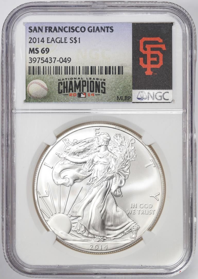 One 2014 $1 American Silver Eagle Coin NGC MS69 San Francisco Giants. NGC Certified.