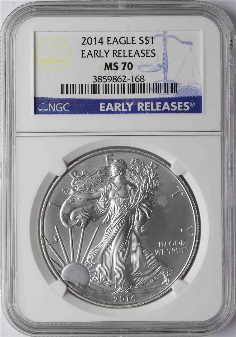 One 2014 $1 American Silver Eagle Coin NGC MS70 Early Releases. NGC Certified.