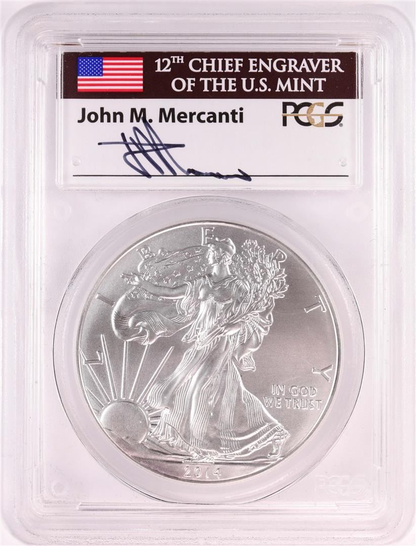 2014 $1 American Silver Eagle Coin PCGS MS70 John Mercanti Signature First Strike