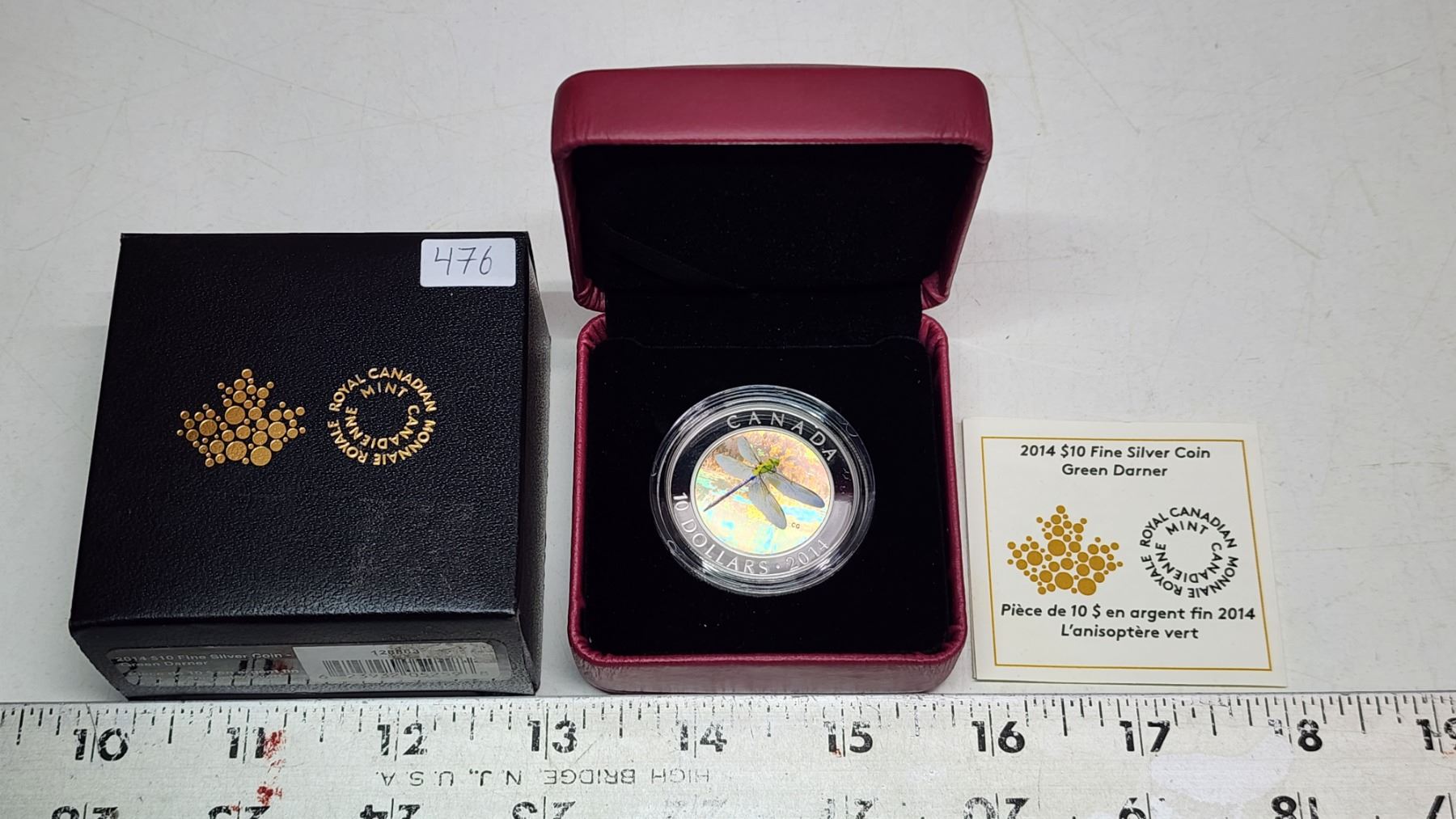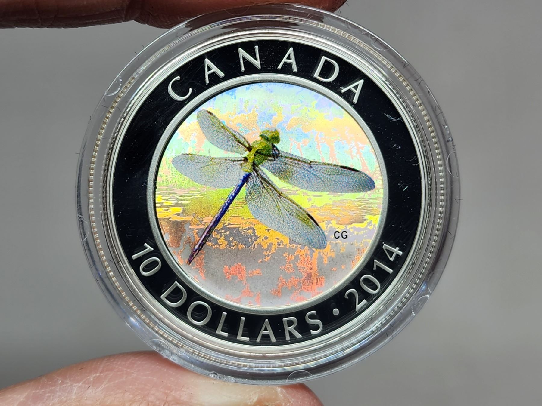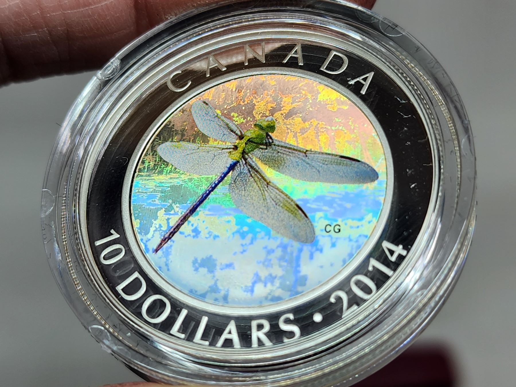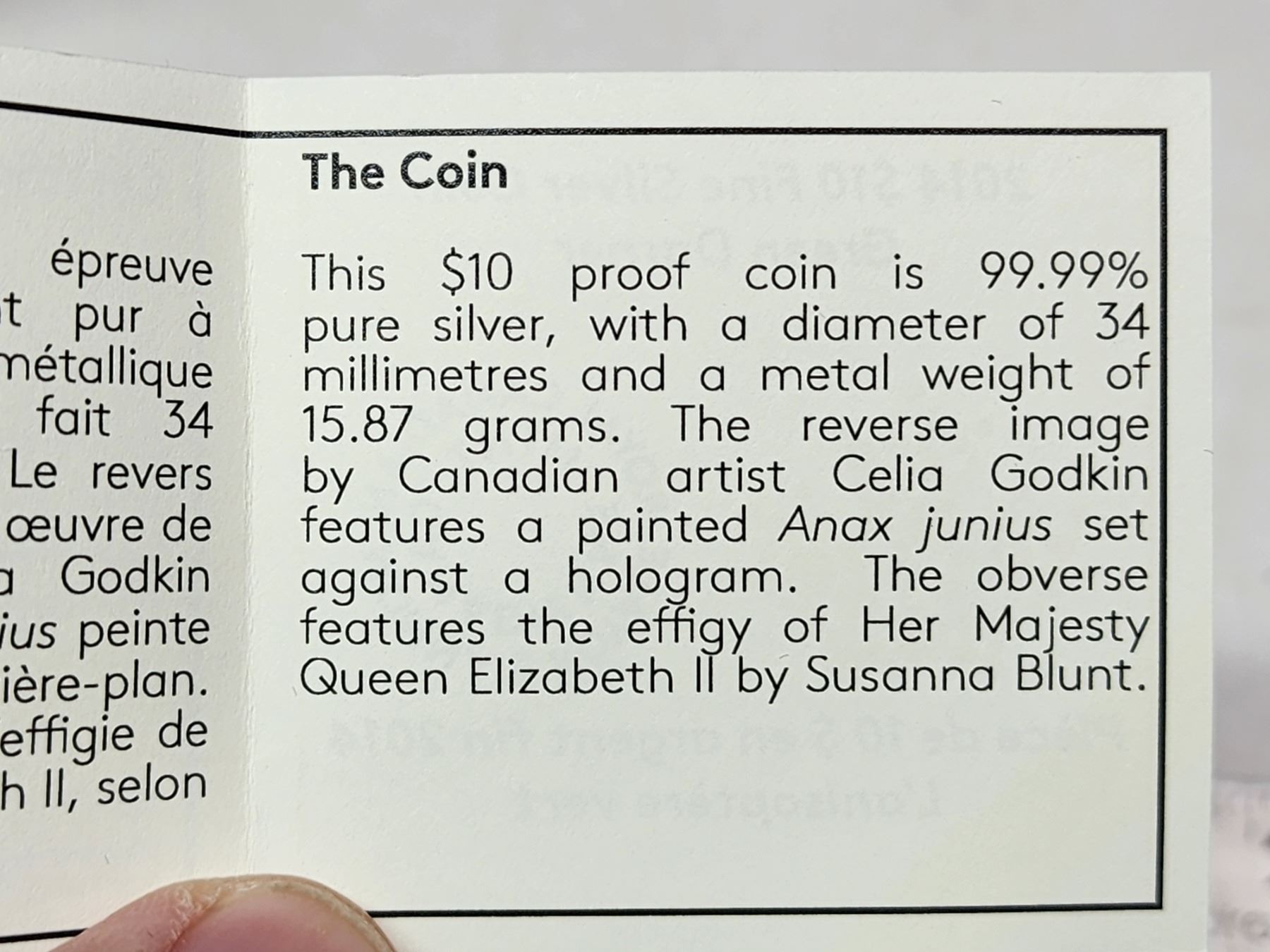 2014 $10 Green Darner Dragonfly. Colourized. 99.99% pure Silver. Proof. Housed in its original RCM case of issue.