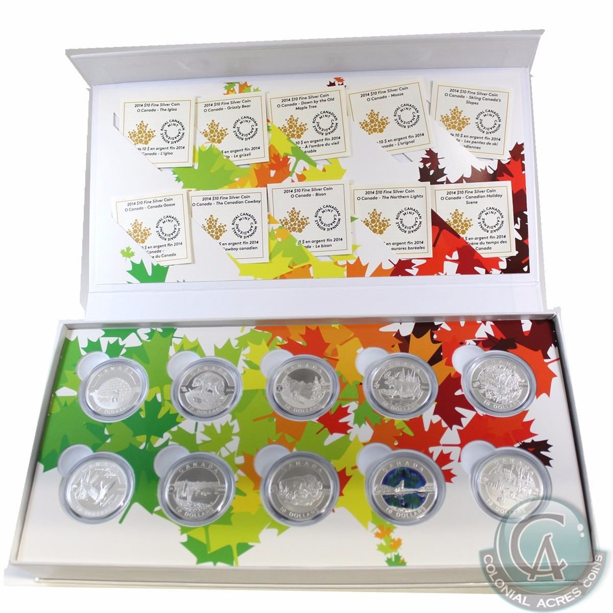 2014 $10 O Canada Complete 10-Coin Fine Silver Set with Deluxe Box (Coloured coin capsule is lightly scratched). TAX Exempt
