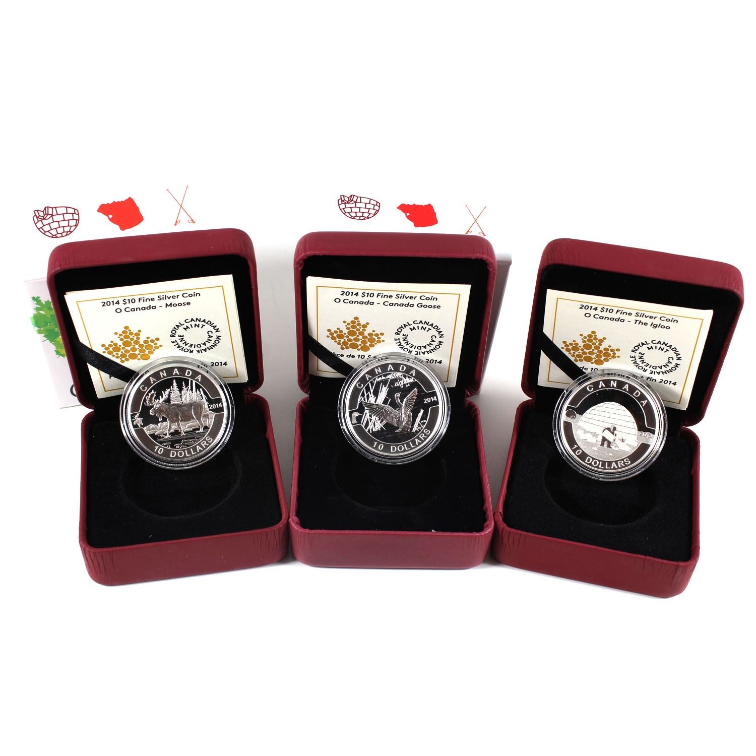 2014 $10 O Canada Fine Silver Coin Series - Canada Goose, Igloo & Moose (Igloo missing outer sleeve). 3pcs (TAX Exempt)