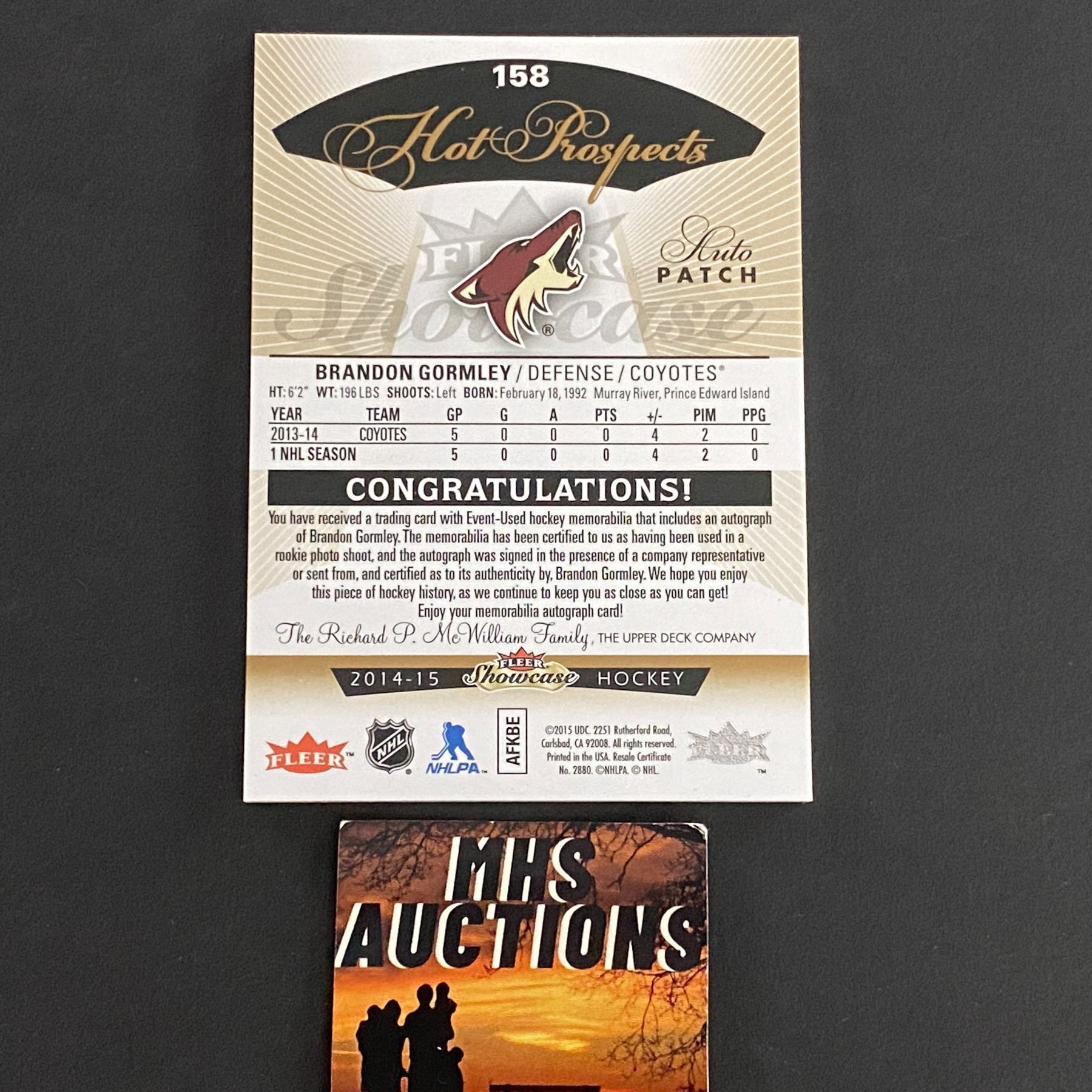 2014-15 FLEER SHOWCASE PATCH/AUTO BRANDON GORMLEY HOCKEY CARD