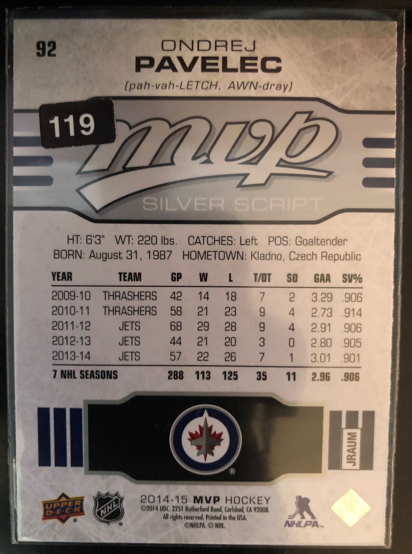 2014-15 MVP Silver Script Ondrej Pavelec Card #92