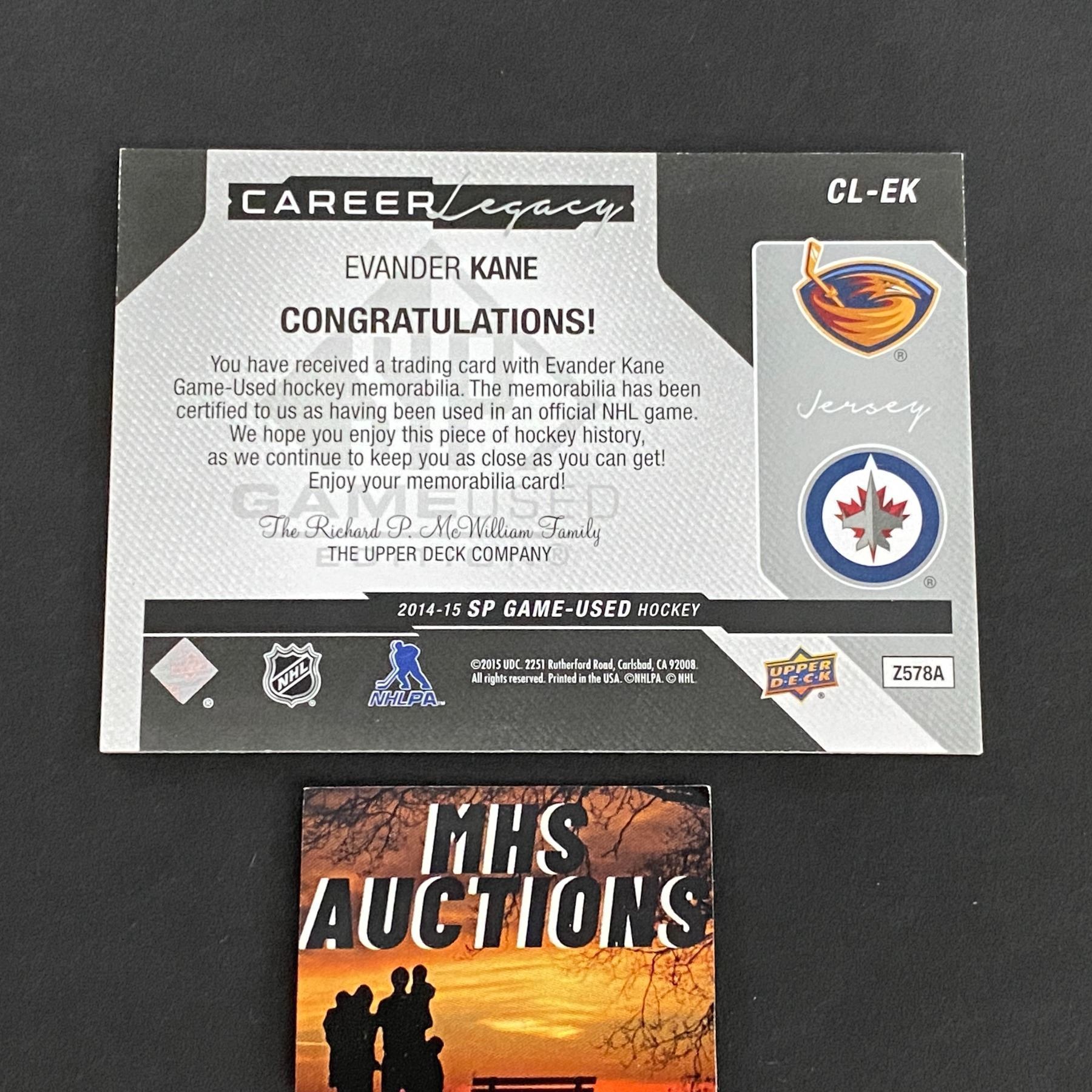 2014-15 U.D SP GAME USED HOCKEY EVANDER KANE JERSEY DUAL CARD