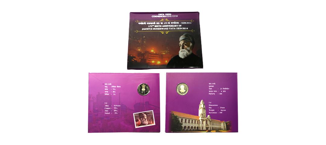 2014, 175th Birth Anniversary of Jamsetji Nusserwanji Tata, UNC set of 1 coin, 5 rupees, in original mint packaging.