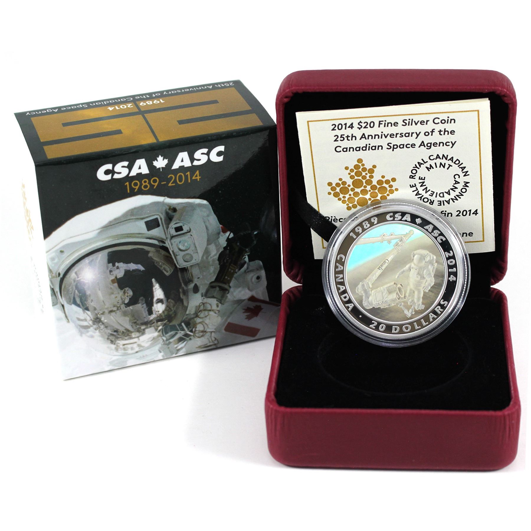 2014 $20 25th Anniversary of the Canadian Space Agency, Fine Silver With Selective Hologram Colour. 3321/10000 (Tax Exempt)