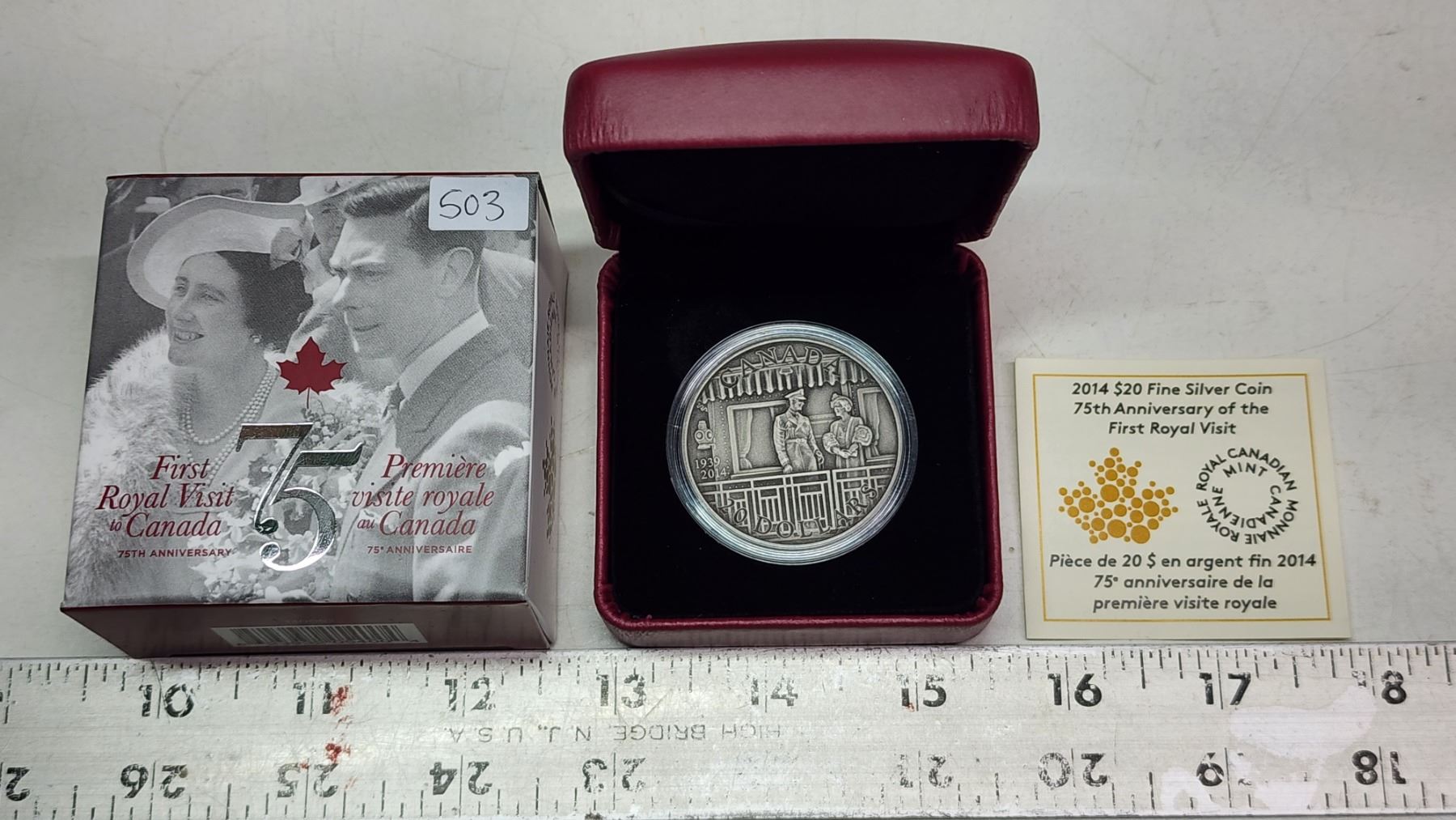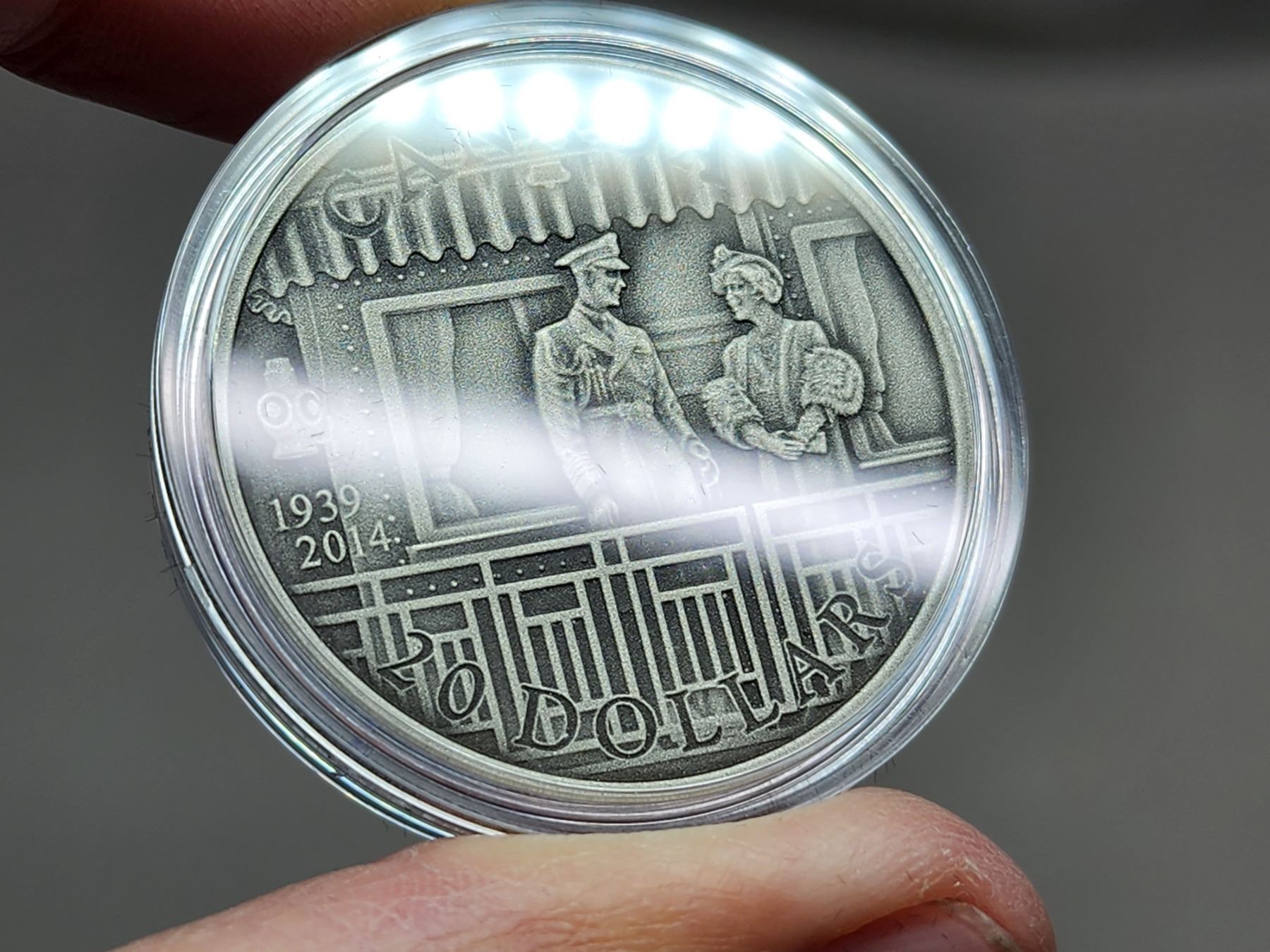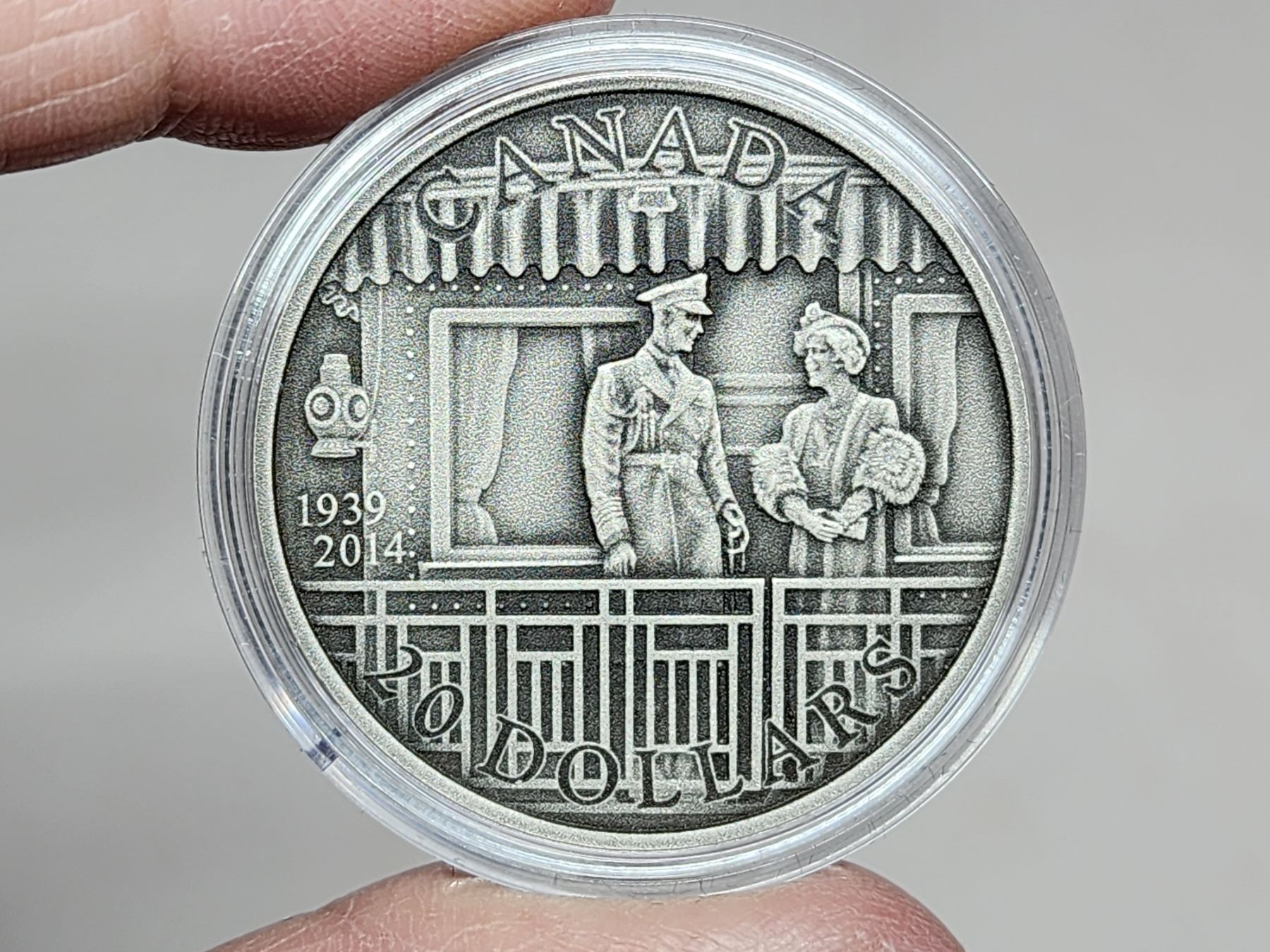2014 $20 75th Anniversary of the First Royal Visit to Canada. Antique Finish. 99.99% pure Silver. Housed in its original RCM case & box of issue.