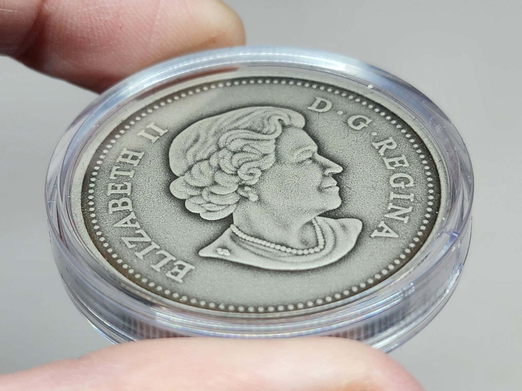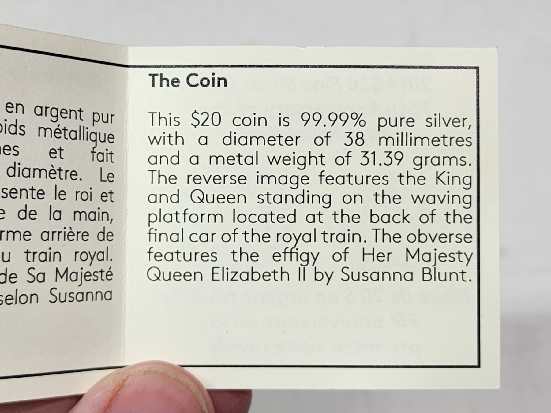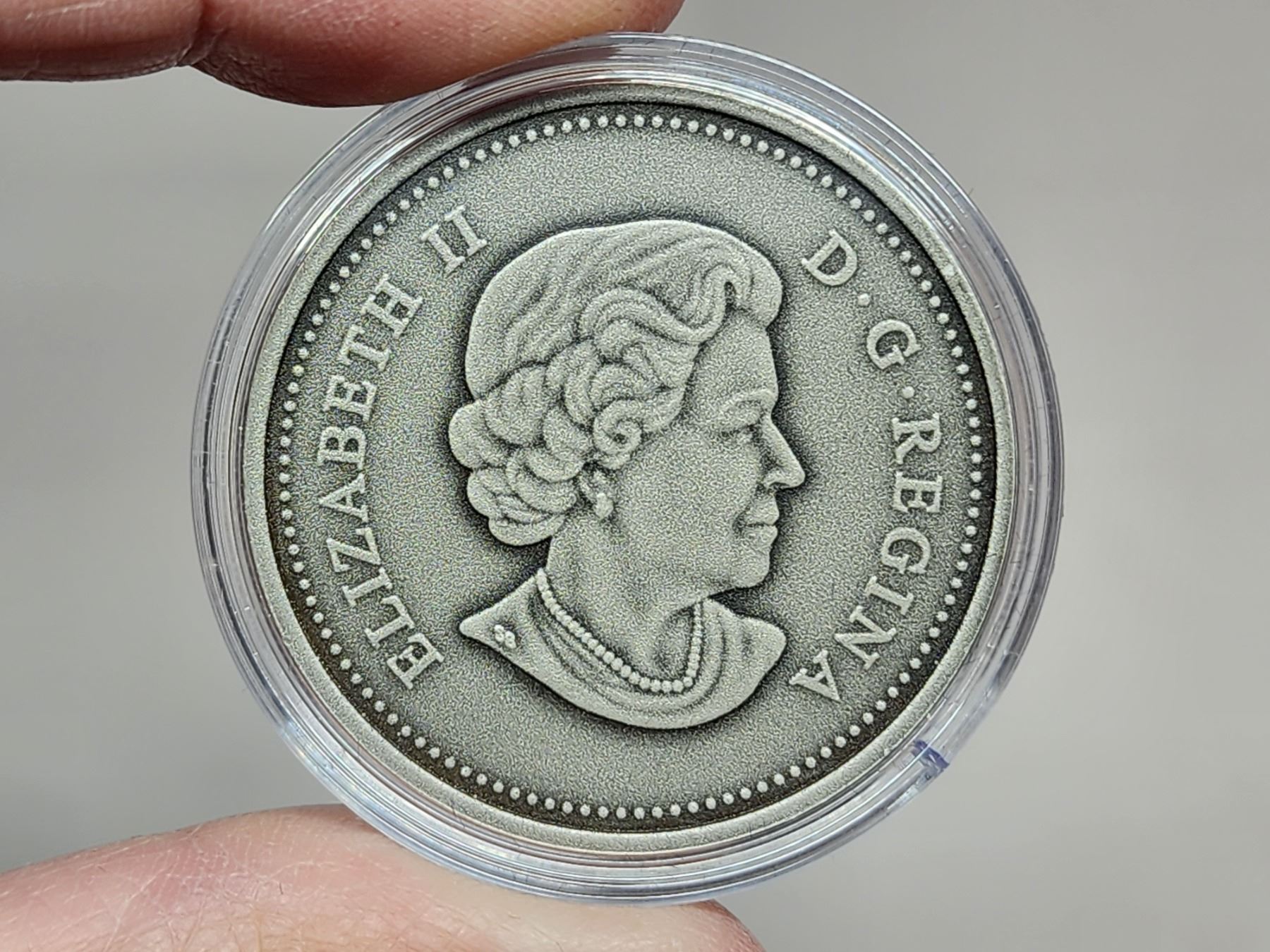 2014 $20 75th Anniversary of the First Royal Visit to Canada. Antique Finish. 99.99% pure Silver. Housed in its original RCM case & box of issue.