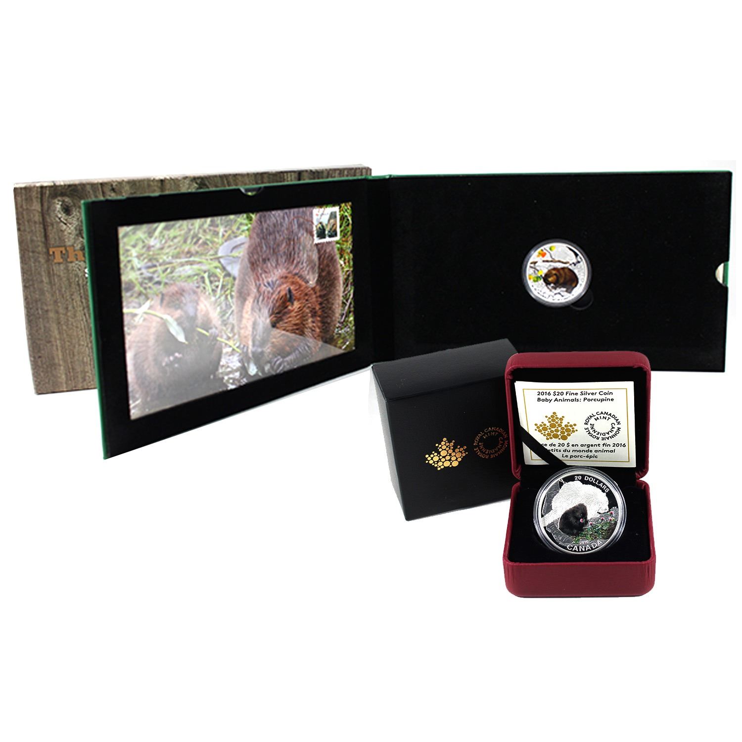 2014 $20 Baby Animals-Beaver Coin/Stamp Set & 2016 $20 Baby Animals Porcupine. Both Coins Fine Silver w/ Selective Colour. Very lightly toned (Tax Exempt)