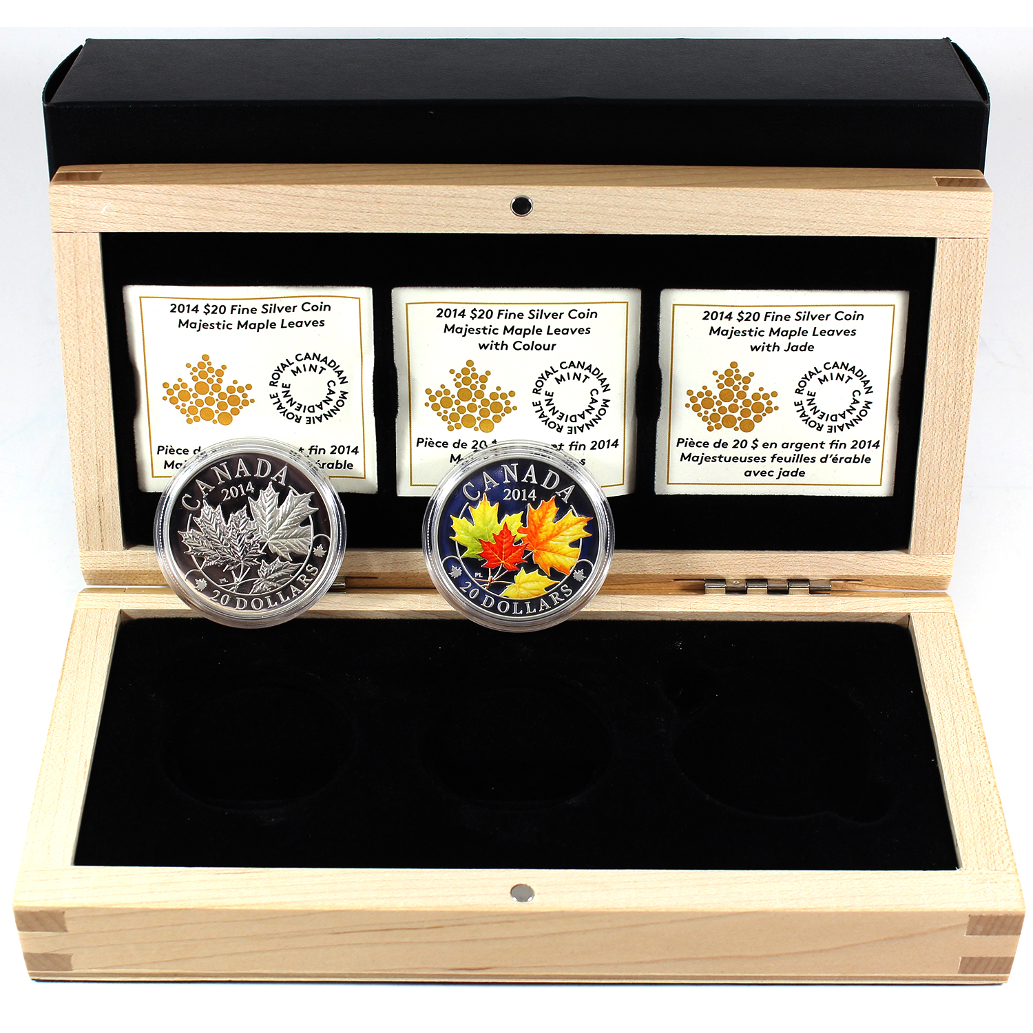 Set contains 2 coins of the 3-coin set. Missing is the Majestic Maple Leaves with Jade.
