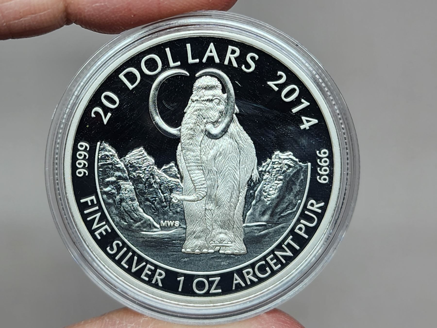 2014 $20 Prehistoric Animals: Woolly Mammoth. 99.99% pure Silver. Proof. Housed in its original RCM case & box of issue.