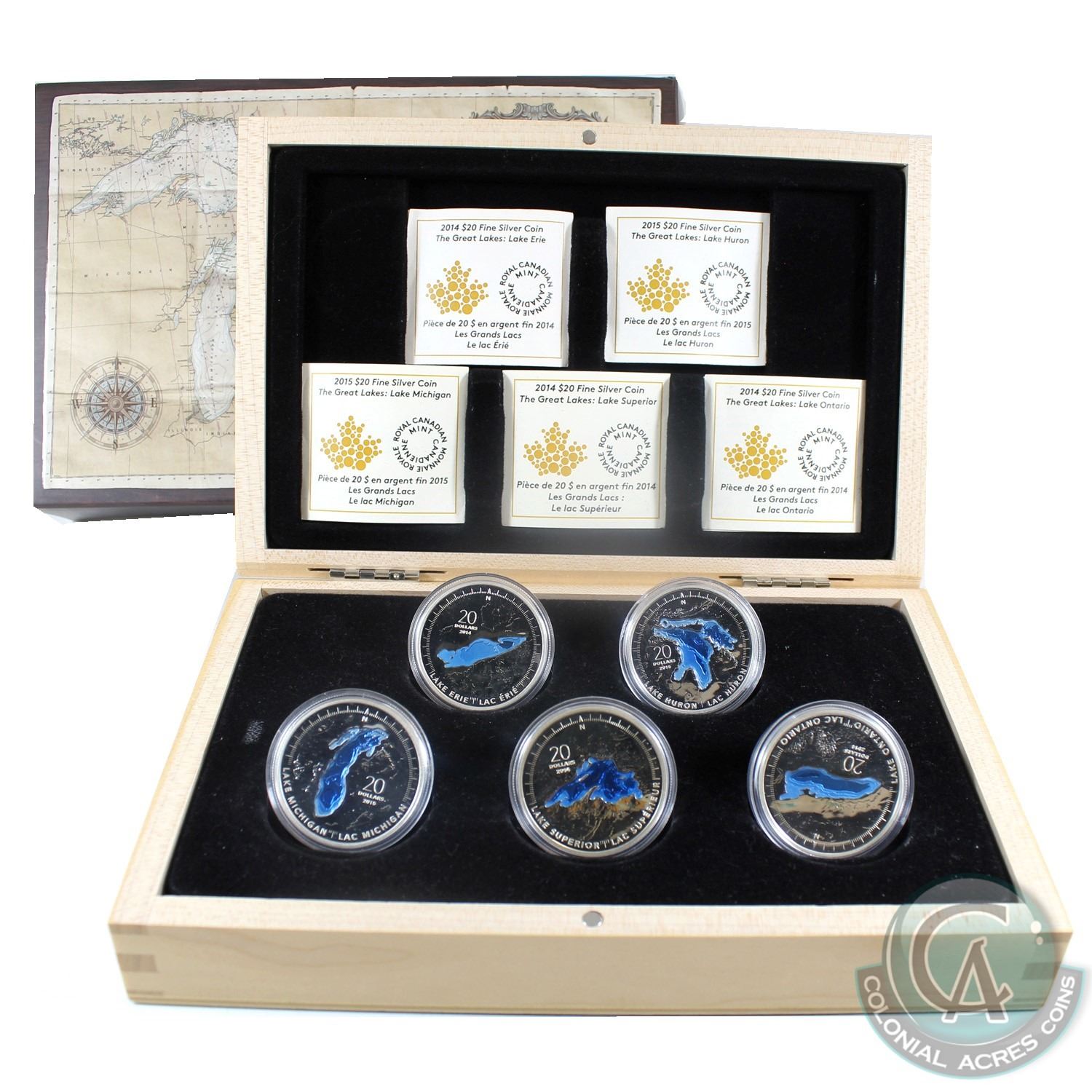 2014-2015 Canada $20 Great Lakes 5-coin Fine Silver Set in Deluxe Case (Sleeve lightly tattered, capsules may be scratched & coins may be lightly toned). (TAX Exempt)