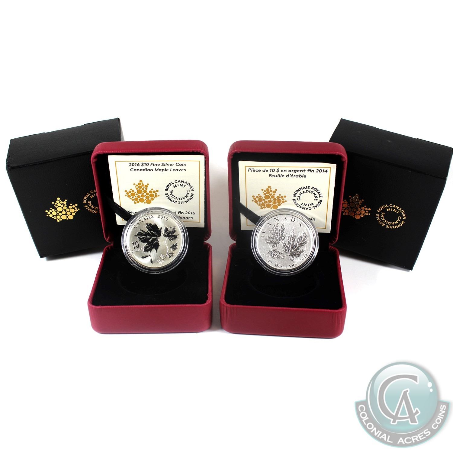 2014 & 2016 Canada $10 Canadian Maple Leaves Fine Silver coins. Coins comes with all the original mint packaging. 2pcs