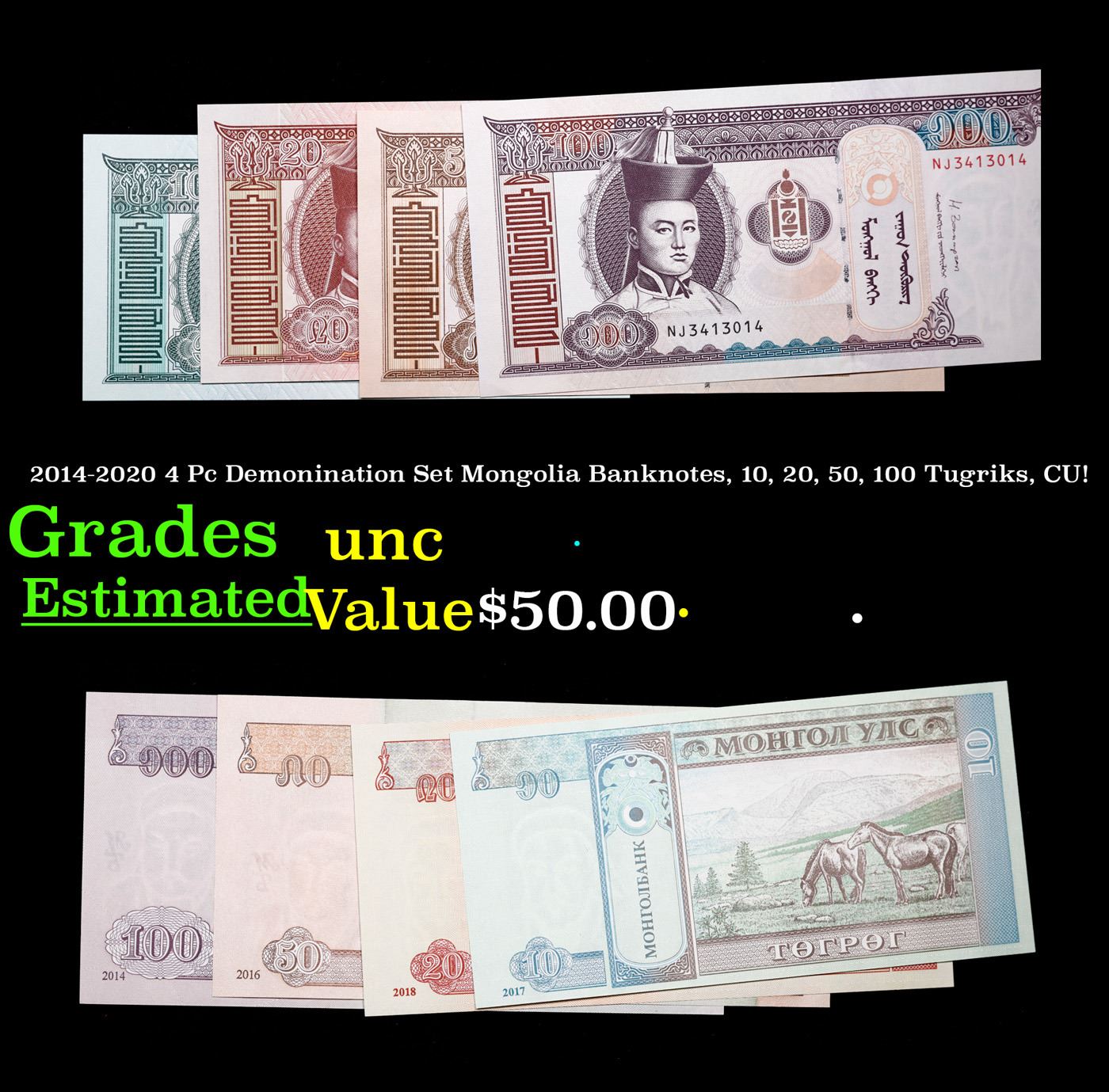 2014-2020 4 Pc Demonination Set Mongolia Banknotes, 10, 20, 50, 100 Tugriks, CU! Grades Brilliant Un