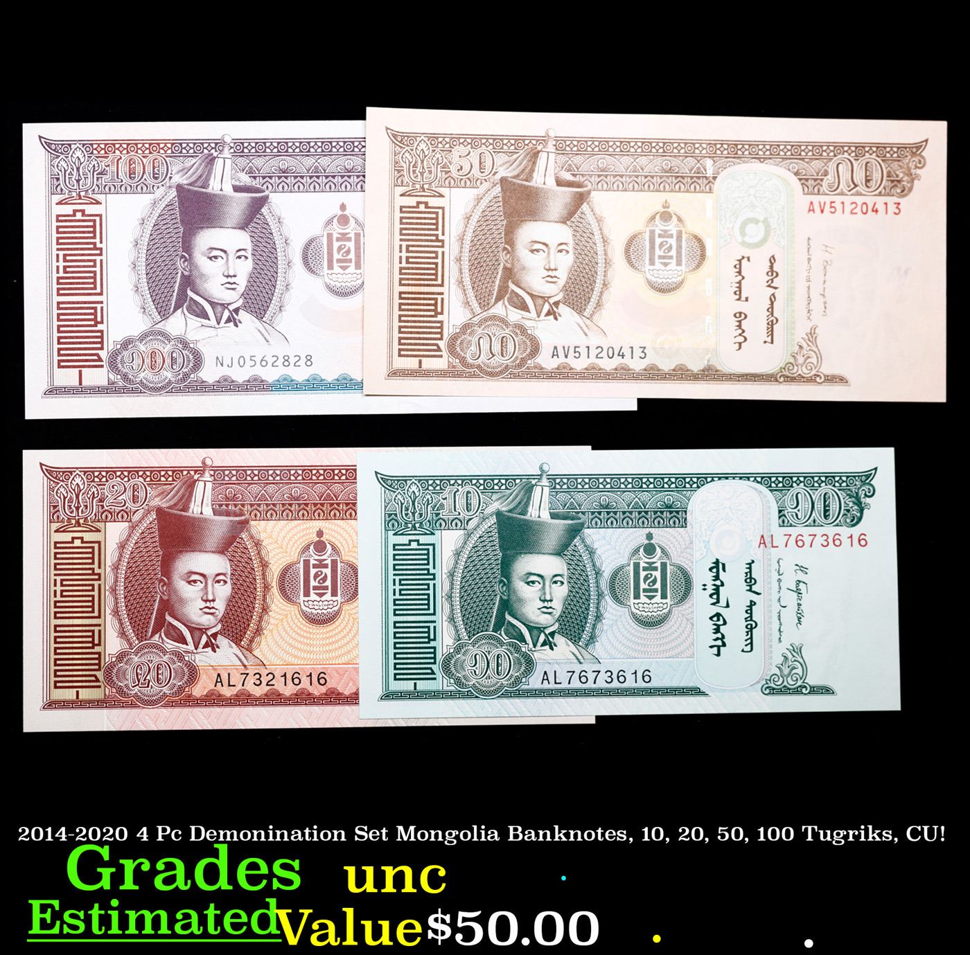 2014-2020 4 Pc Demonination Set Mongolia Banknotes, 10, 20, 50, 100 Tugriks, CU! Grades Brilliant Un