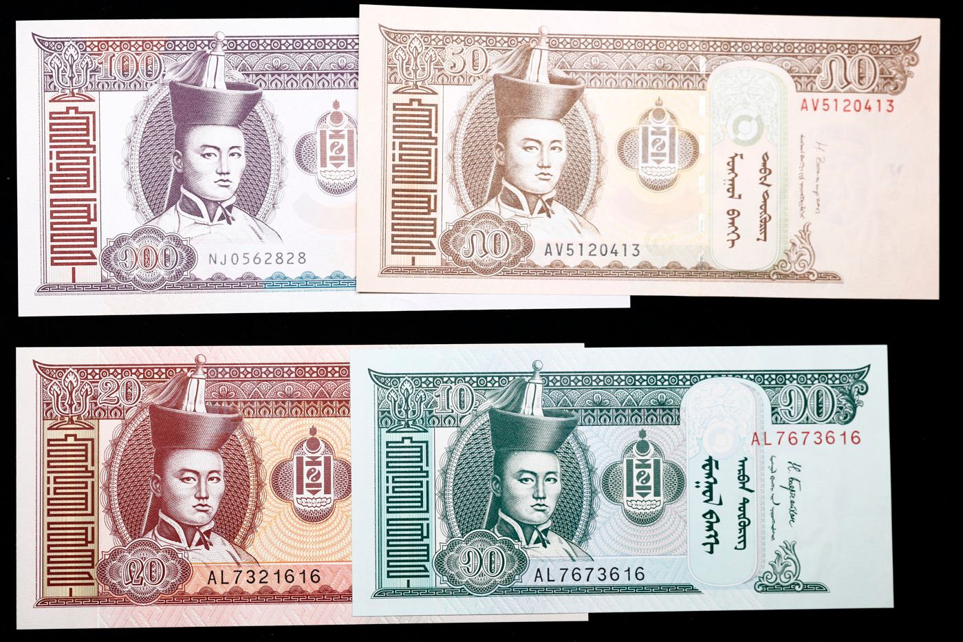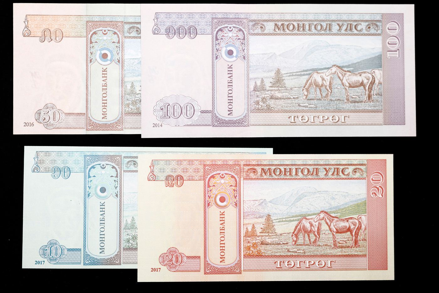 2014-2020 4 Pc Demonination Set Mongolia Banknotes, 10, 20, 50, 100 Tugriks, CU! Grades Brilliant Uncirculated.