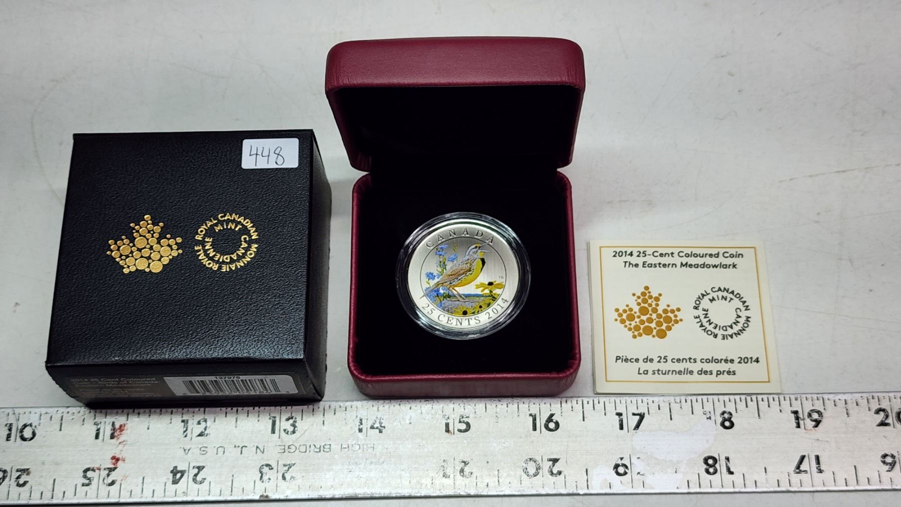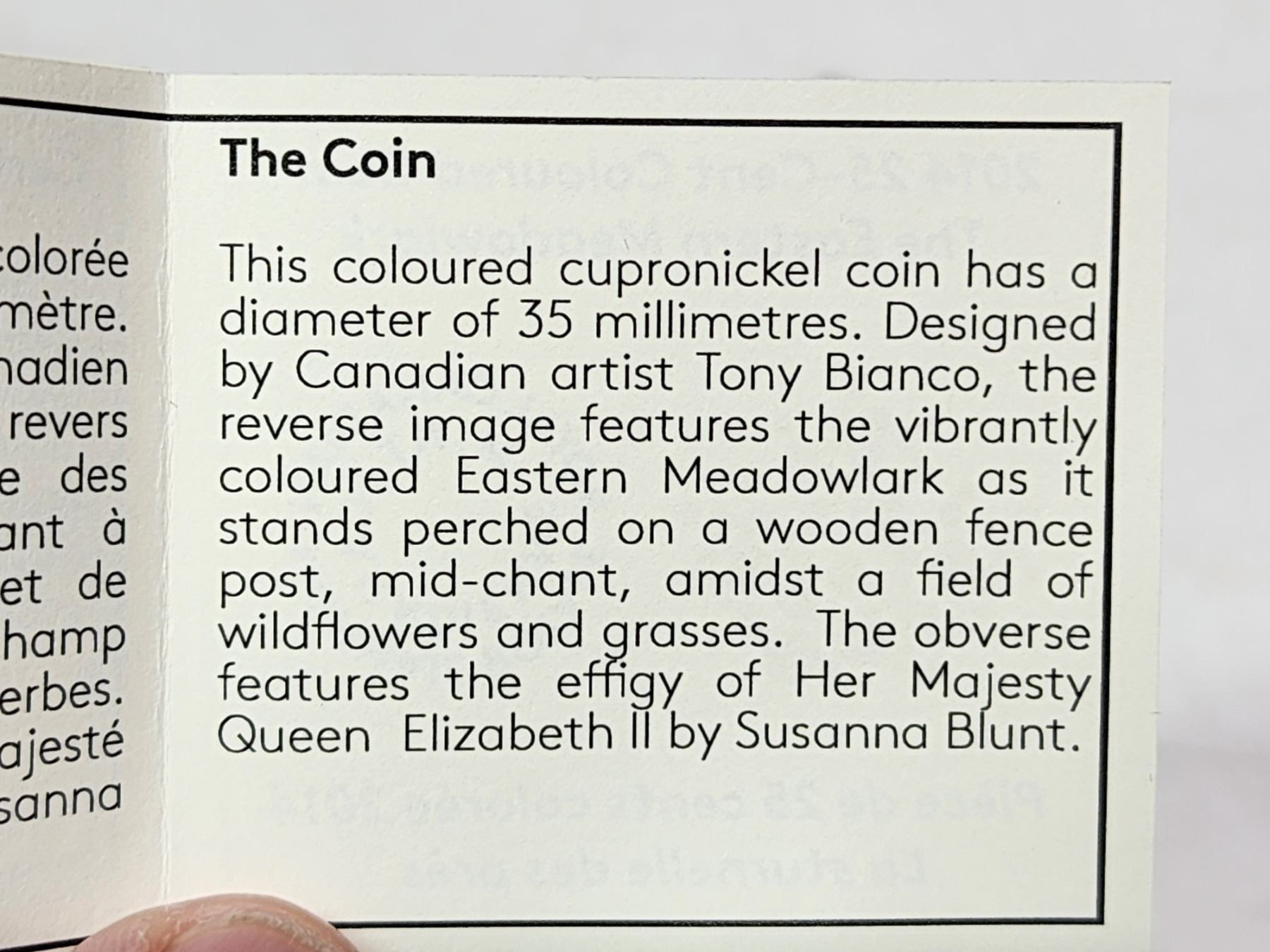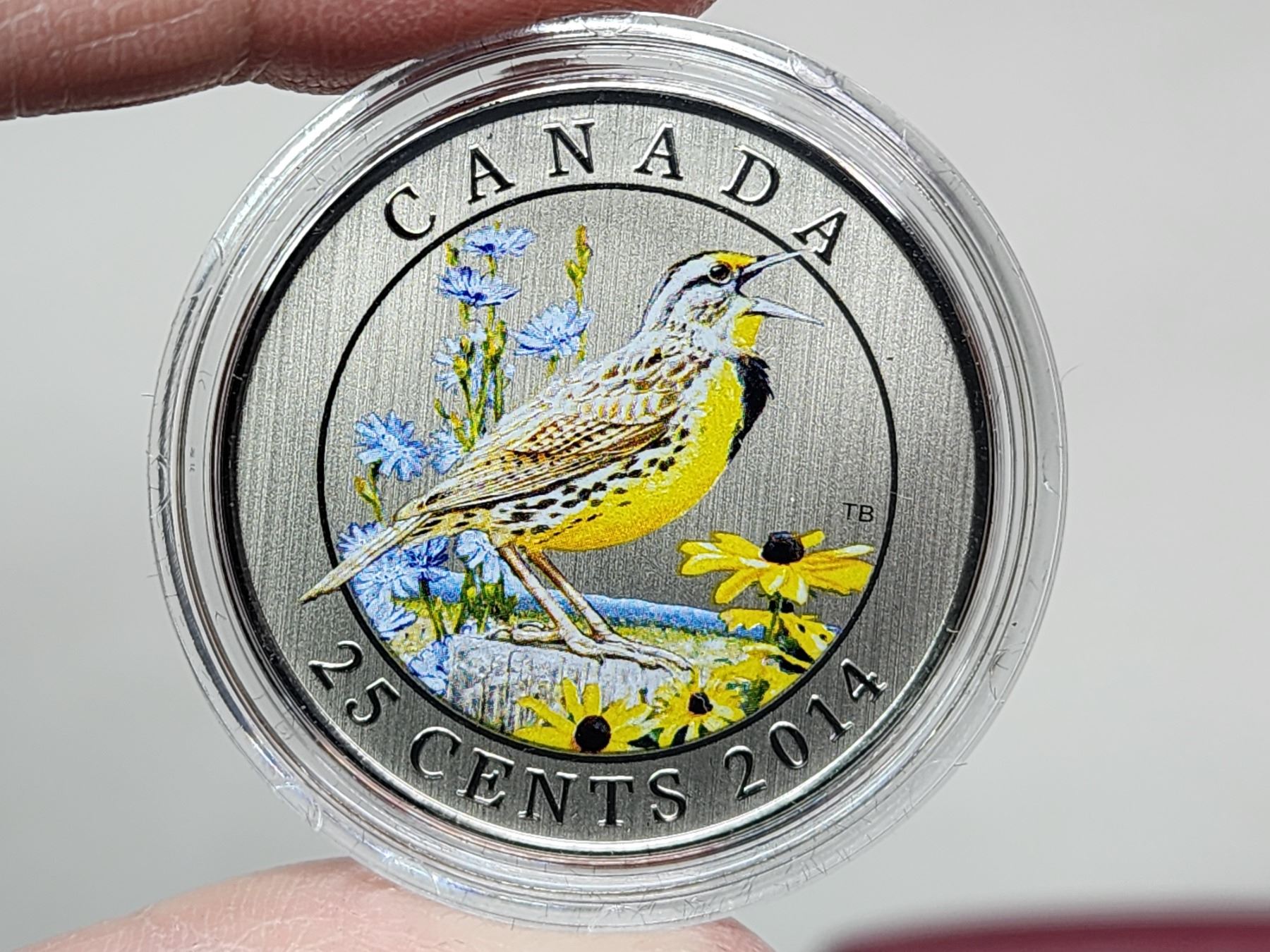 2014 25 Cent Colourized Eastern Meadow Lark. Specimen. Housed in its original RCM case & box of issue.
