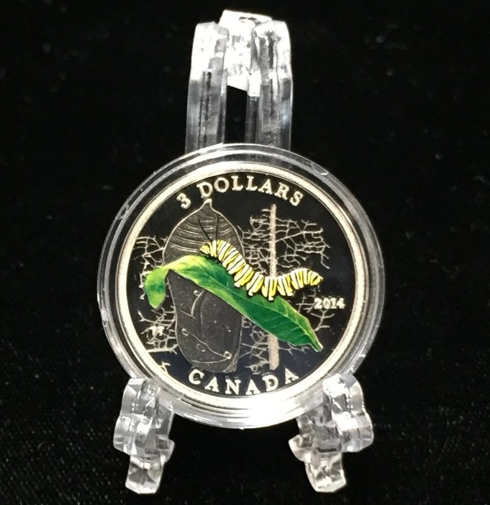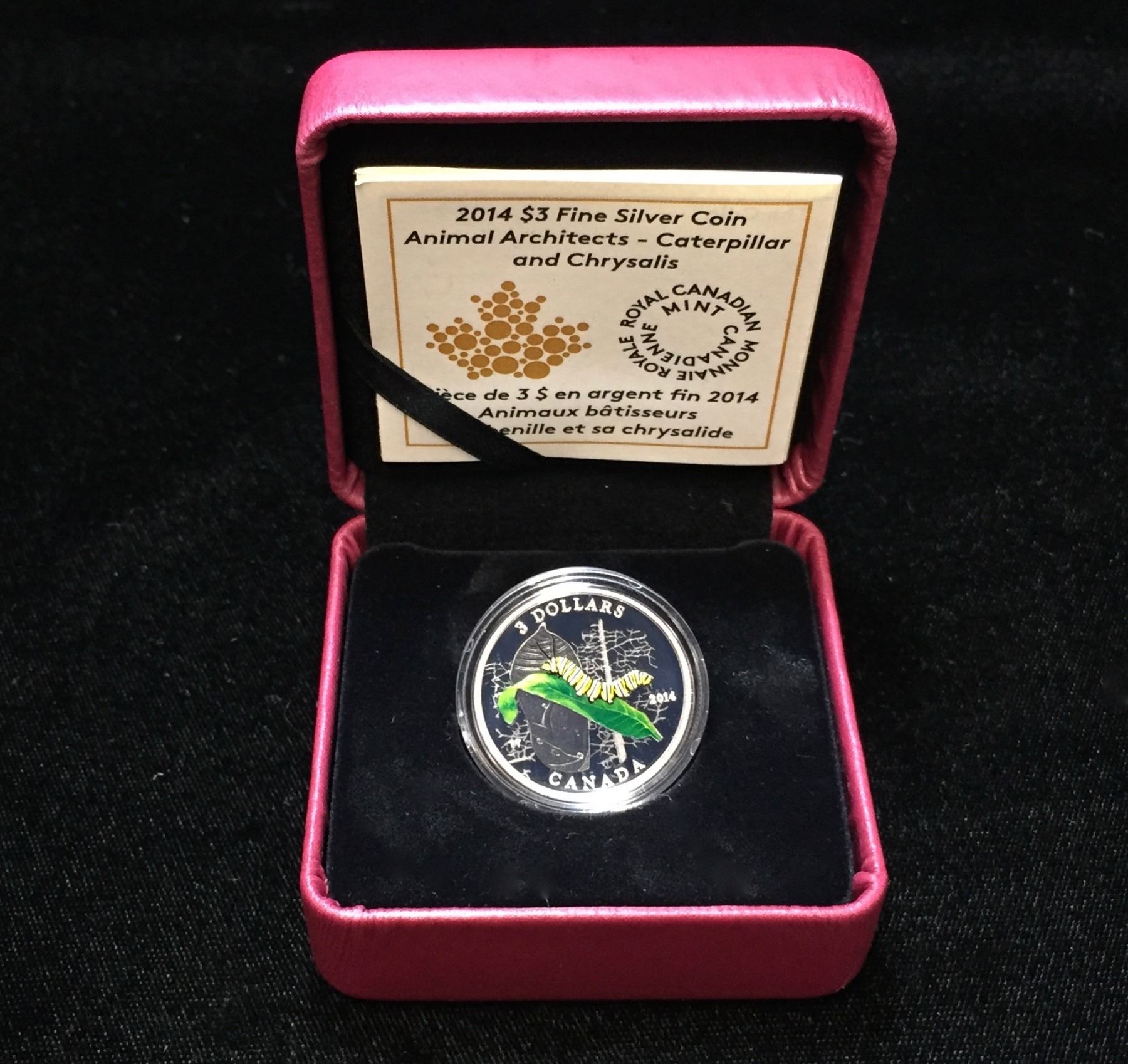 Lot 42; Fine Silver .9999 2014 $3 Animal Architects - Caterpillar and Chrysalis, Selective Colour, Proof Finish, Includes COA and RCM Packing