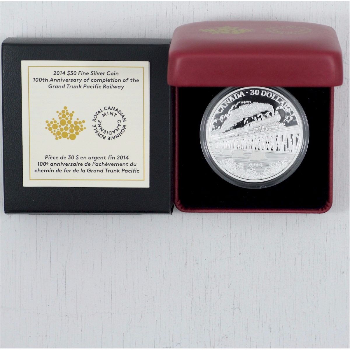 2014 $30 100th Anniversary of the Completion of the Grand Trunk Pacific Railway Fine Silver coin issued by the RCM (TAX Exempt) - sticker residue on outer shipper. Buyers Premium will be added on all items as per our terms of sale. We accept Paypal, Credit Card, E-Transfer Payments, Cheque or Money Orders (there is an additional 3% fee for using Paypal or Credit Card). All invoices will be emailed immediately following the auction, please contact us if you would like to pay by credit card or receive a new revised lower total for mailing in payment or sending an e-transfer (3% discount). All Items Are Sold "AS IS", no returns