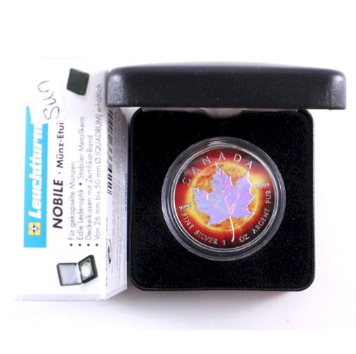 2014 $5 1oz. Silver Maple Leaf Gilded Blazing Sun, in black display box with capsule. (Tax Exempt)