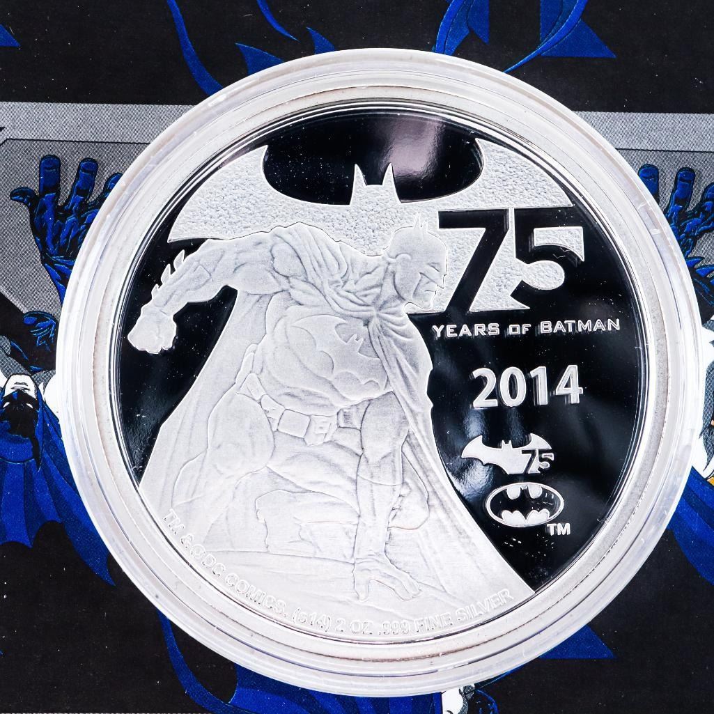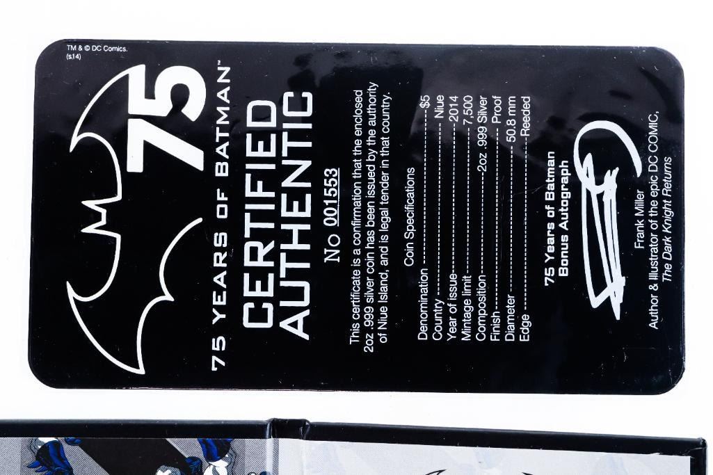 2014 $5 75 Years of Batman - Pure Silver Coin -Celebrate 75 Years of Batman with this 2 ounce collector coin, along with lapel pin and metal numbered certificate of authenticity including the facsimile signature of Frank Miller. Use the included card & download the 75 Years of BATMANª Experience App to activate 3D Augmented Reality. SOLD OUT ISSUE-1001019