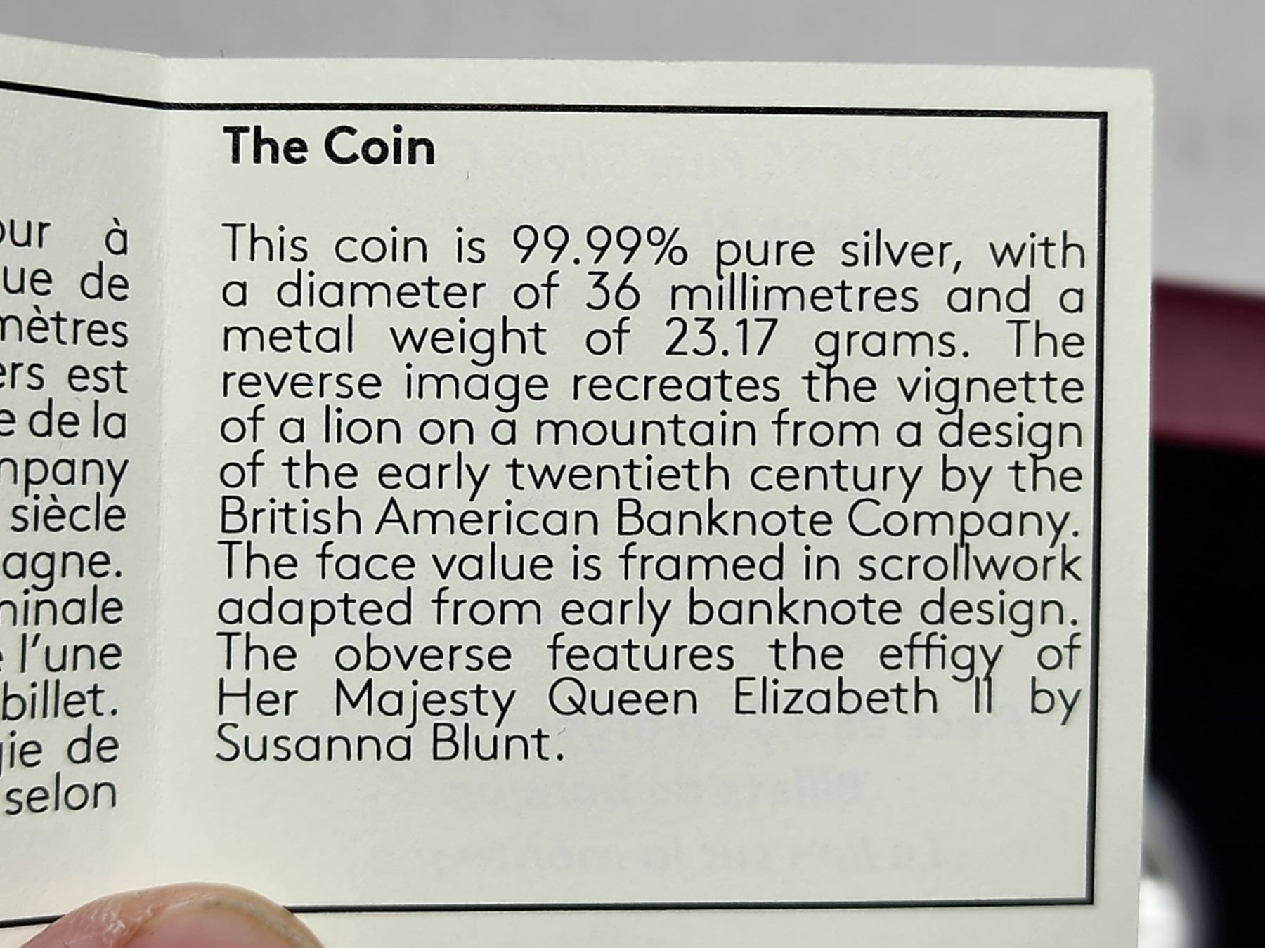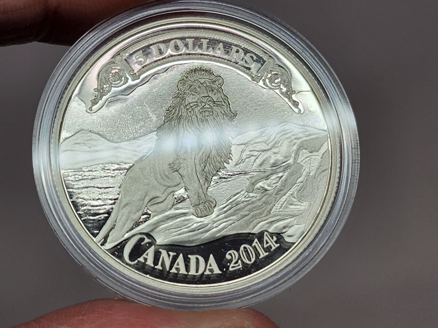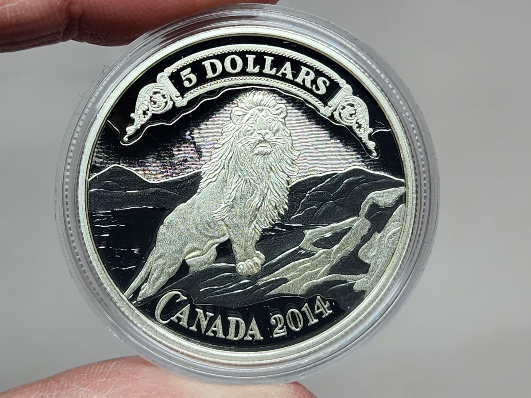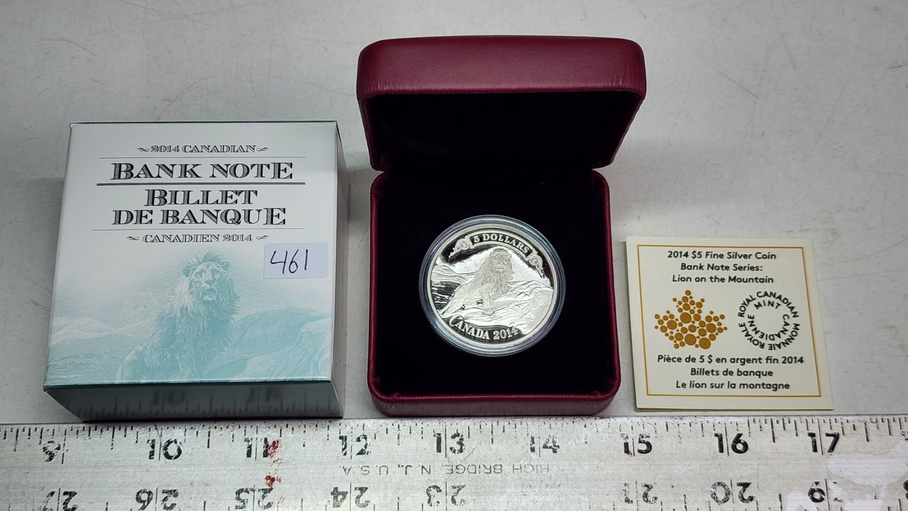 2014 $5 Bank Note Series: Lion on the Mountain. 99.99% pure Silver. Proof. Housed in its original RCM case & box of issue.