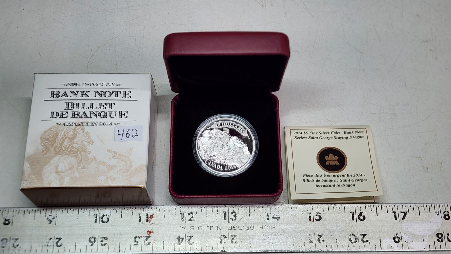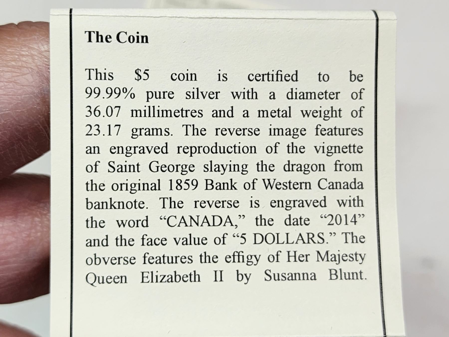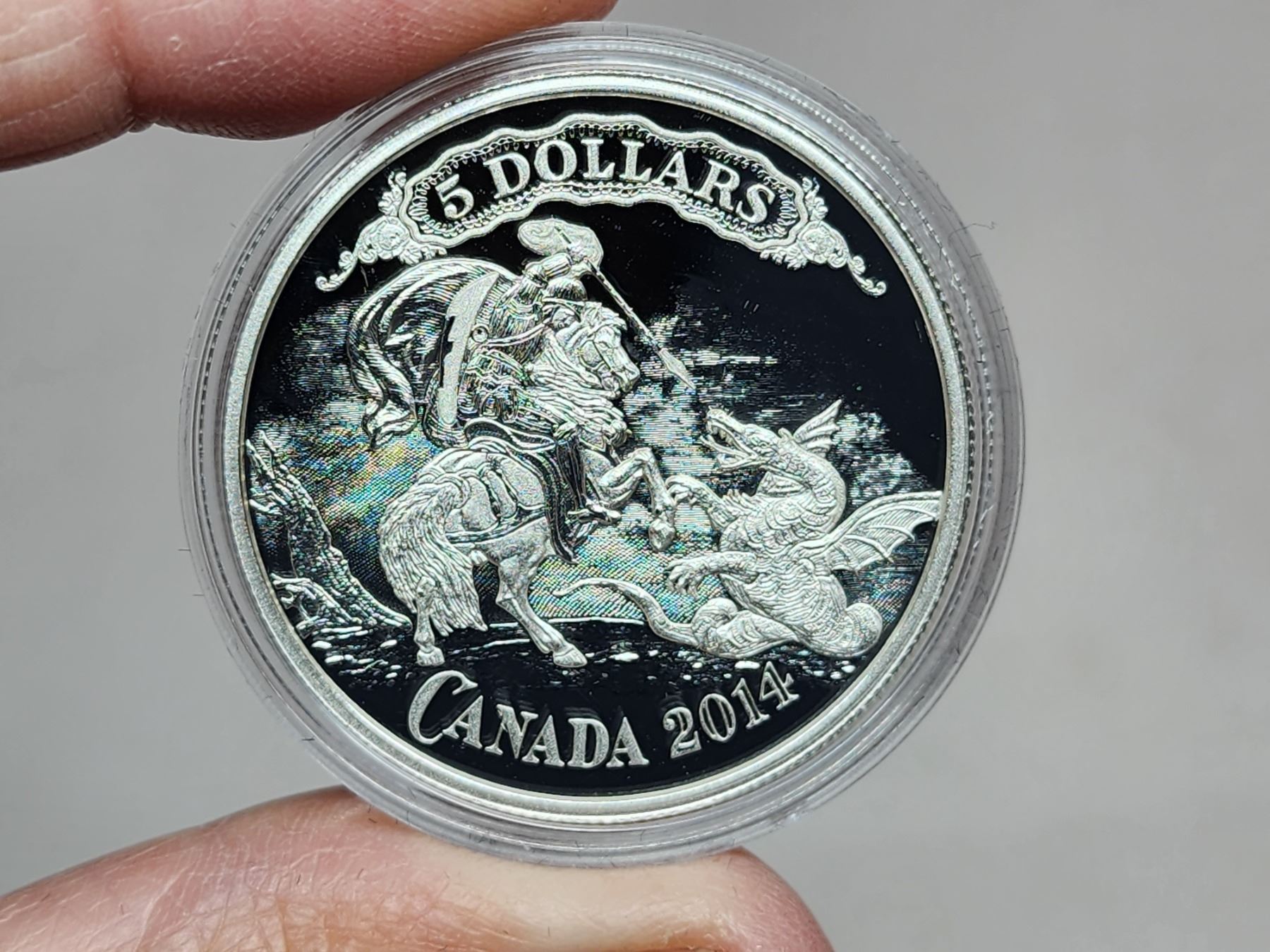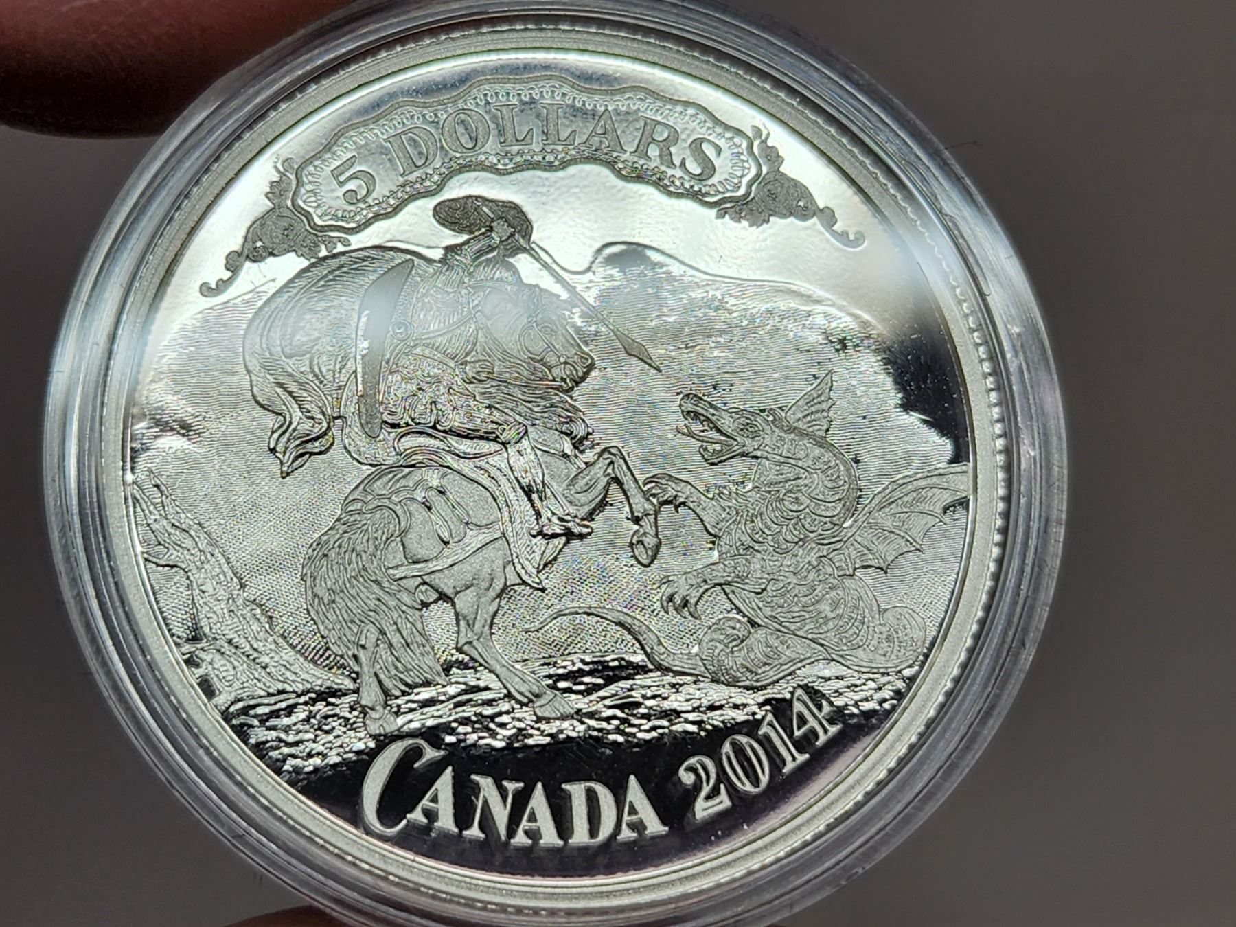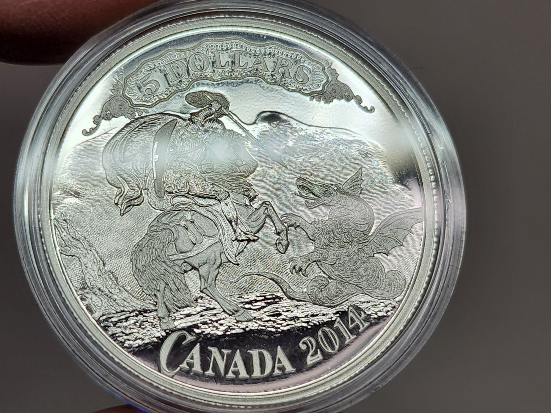 2014 $5 Bank Note Series: Saint George Slaying Dragon. 99.99% pure Silver. Proof. Housed in its original RCM case & box of issue.