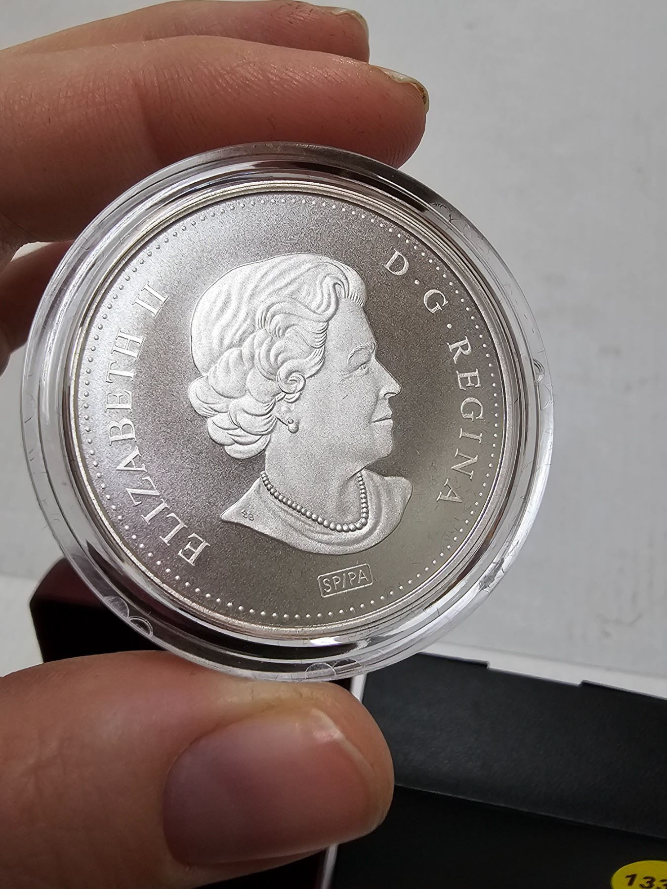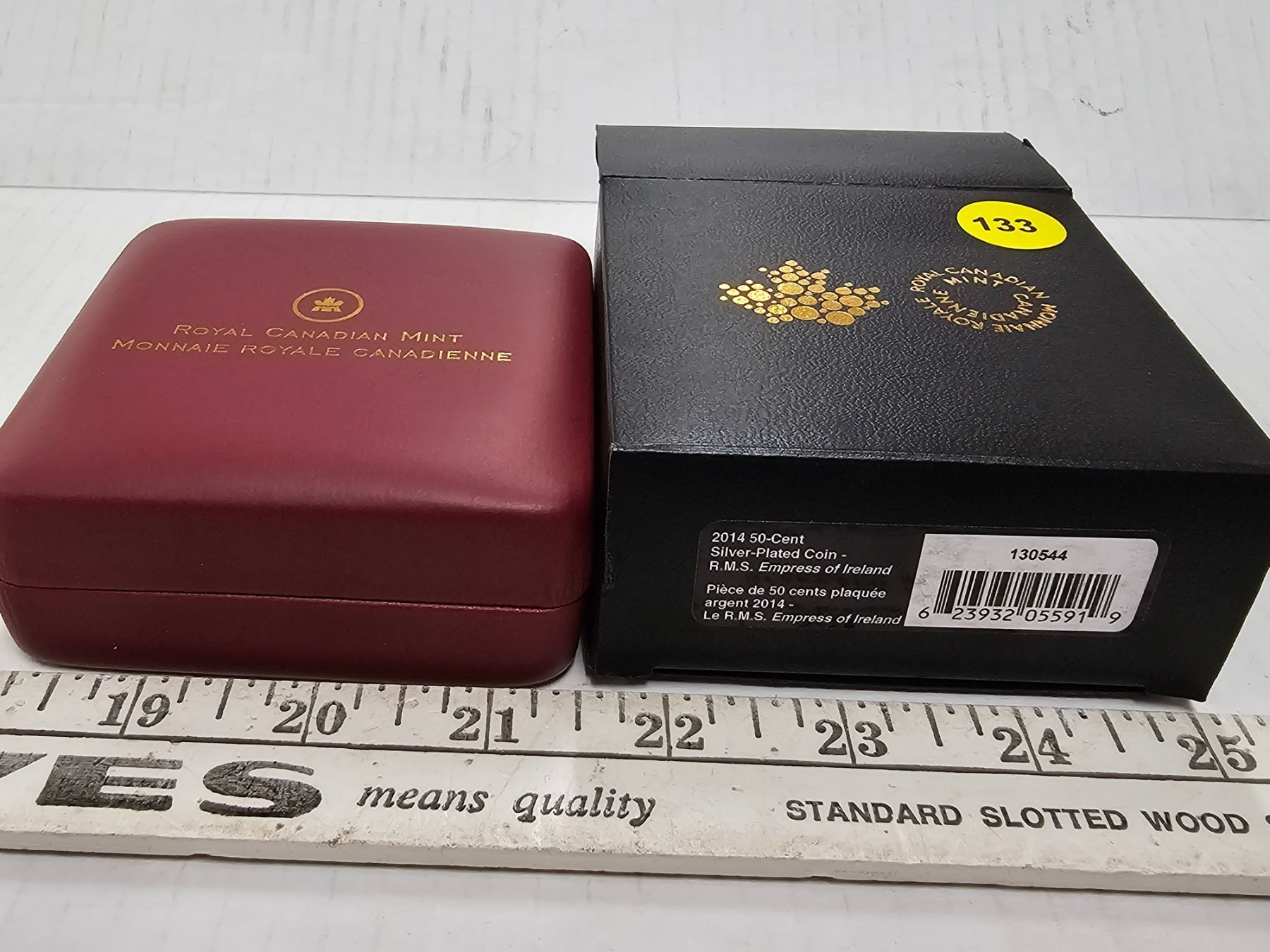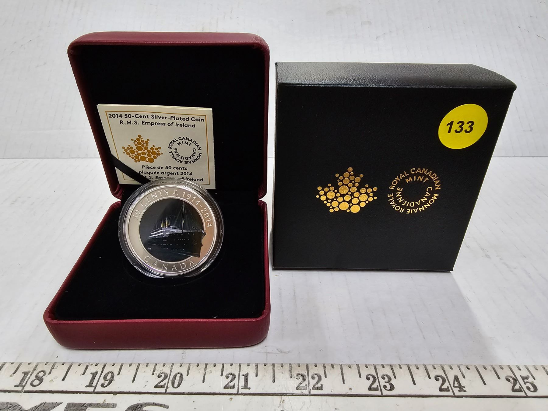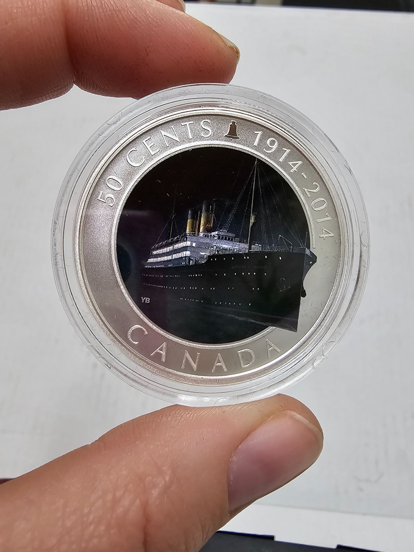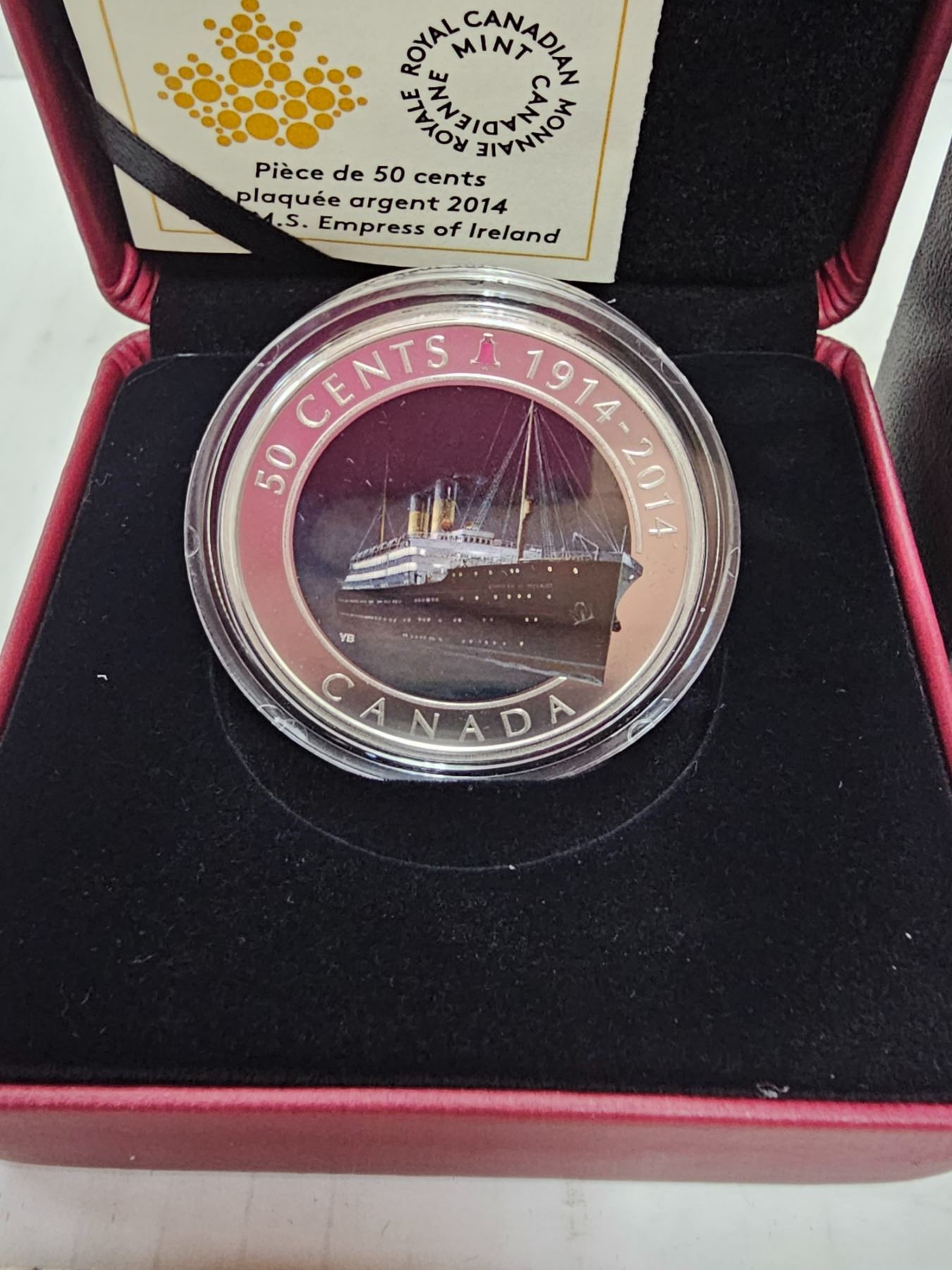 2014 50 cent R.M.S. empress of Ireland. Silver plated colourized coin depicting the ship sailing through fog before sinking. Proof with ultra heavy cameo. Housed in its original royal canadian mint case & box of issue, along with a certificate of authenticity.