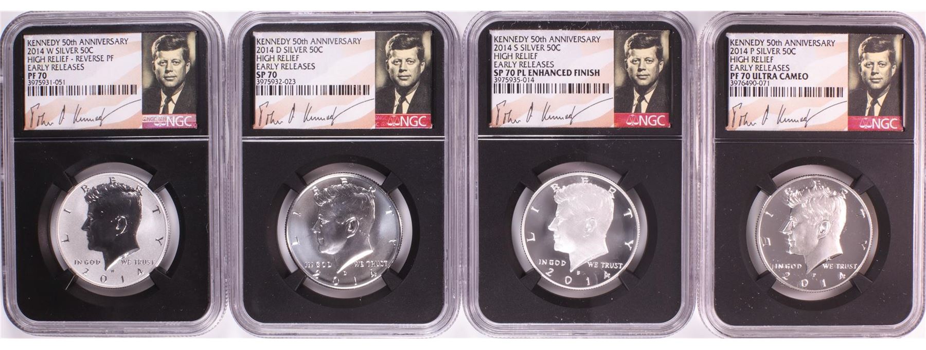 One 2014 50th Anniversary Kennedy Half Dollar (4) Coin Set NGC PF70/SP70. NGC Certified.