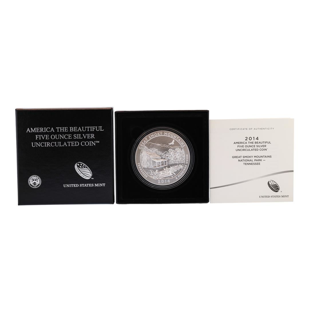 One 2014 5oz Silver ATB Great Smokey Mountain Tennessee Silver Proof Coin w/box.