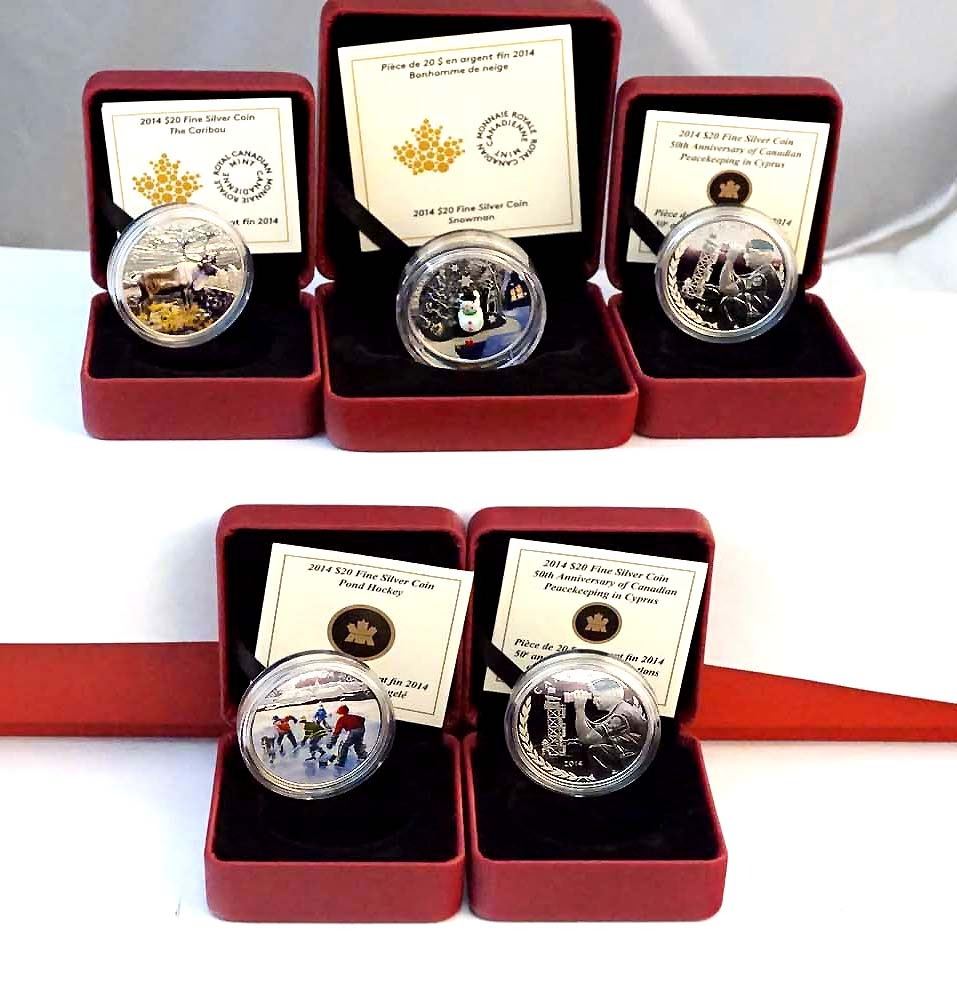 2014 A Lot of 5 x $20.00 of Mixed Themes .9999 5.05 AG w/COA, Box and Sleave
