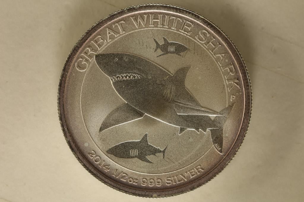 SHARK 1/2 TROY OZ. .999 FINE SILVER, SPOTS NOTICED