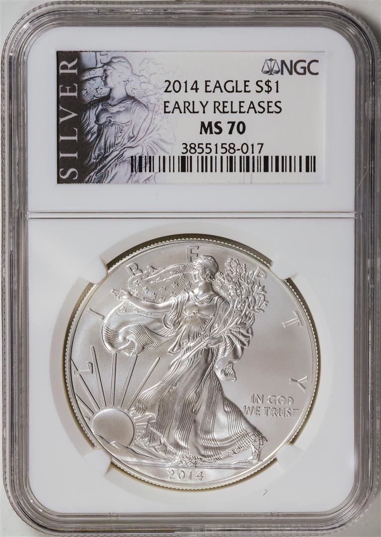 One 2014 American Silver Eagle .999 Fine Silver Dollar Coin NGC MS70.