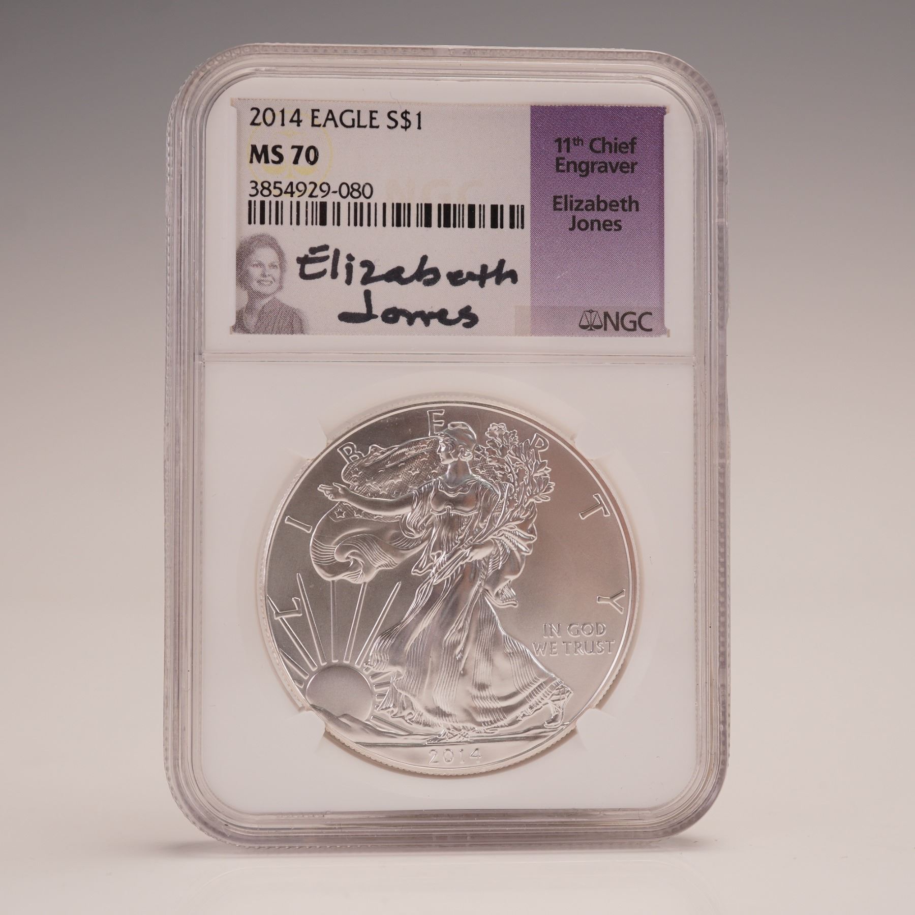Certified by NGC as Mint State 70 and encapsulated with a special label hand signed by Elizabeth Jones, the 11th Chief Engraver of the United States Mint. Struck in one troy ounce of .999 fine silver. The obverse features Adolph A. Weinman's Walking Liberty design striding forward with the folds of the flag around her, her right hand extended, and branches of laurel and oak in her left. The reverse, designed by John Mercanti (b. 1943), features the heraldic eagle with shield and thirteen five-pointed stars above. Encapsulation includes certification number.