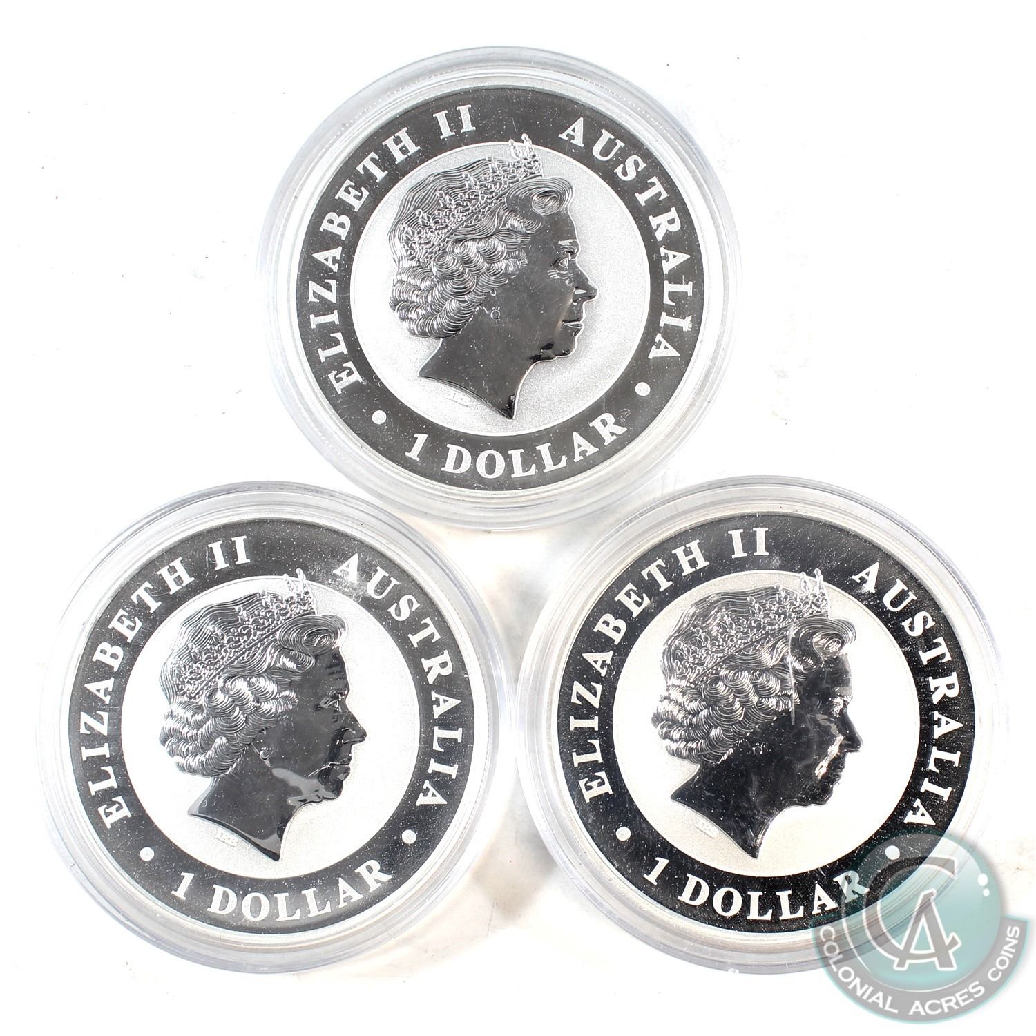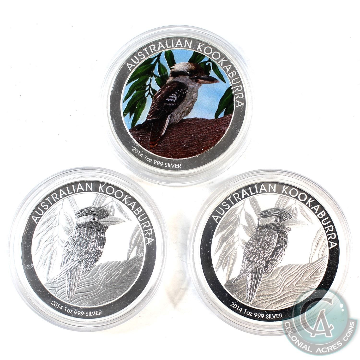 2014 Australia 1oz Kookaburra .999 Fine Silver Coins in Capsules. You will receive a coloured version and 2 normal ones (Capsules are scratched). 3pcs (TAX Exempt)