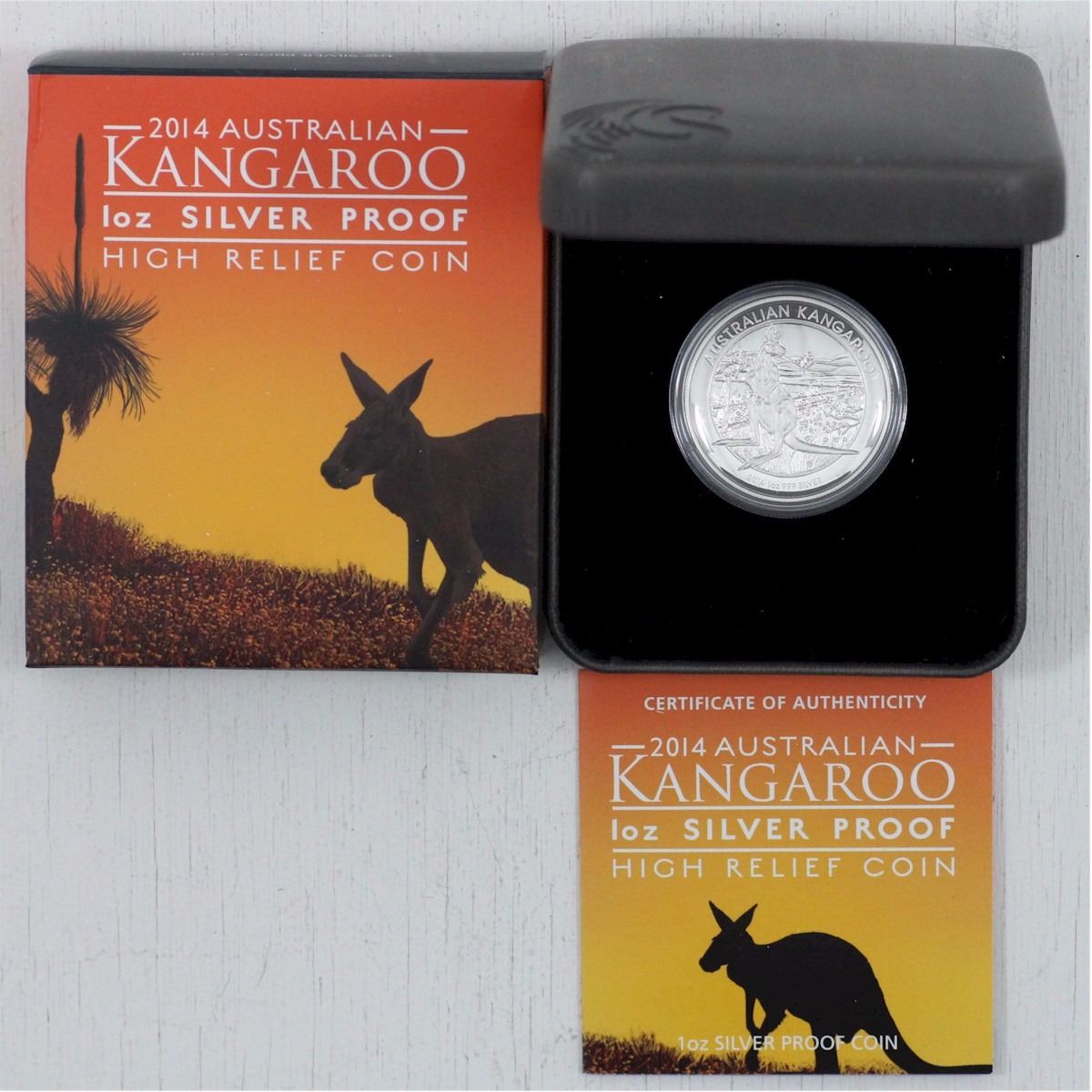 2014 Australian $1 1oz Silver Proof High relief Kangaroo Coin issued by the Perth Mint - TAX Exempt. Buyers Premium will be added on all items as per our terms of sale. We accept Paypal, Credit Card, E-Transfer Payments, Cheque or Money Orders (there is an additional 3% fee for using Paypal or Credit Card). All invoices will be emailed immediately following the auction, please contact us if you would like to pay by credit card or receive a new revised lower total for mailing in payment or sending an e-transfer (3% discount). All Items Are Sold "AS IS", no returns