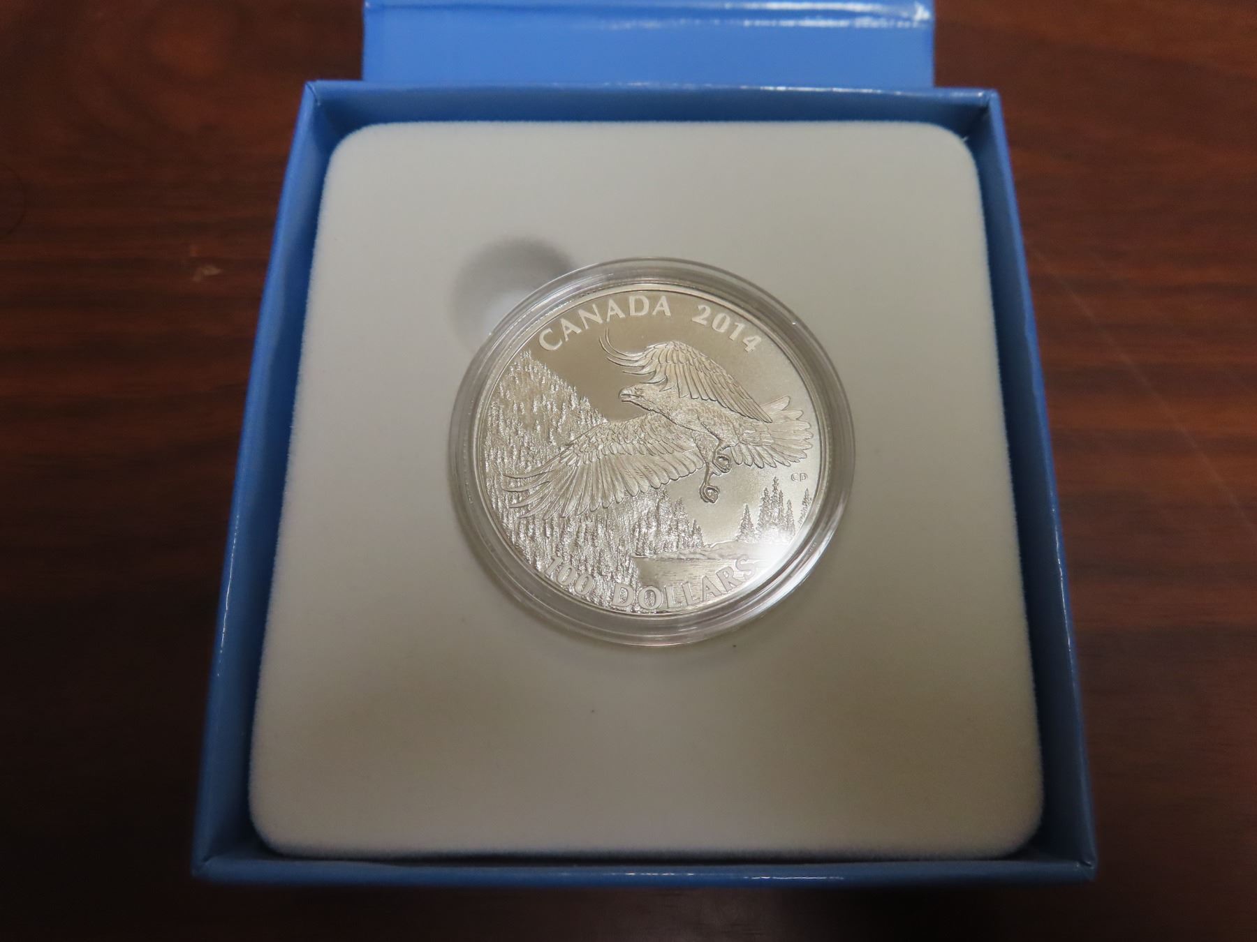 2014 Bald Eagle $100. 99.99% pure Silver. Proof with Ultra Heavy Cameo. Housed in its original Royal Canadian Mint case & box of issue. Includes Certificate of Authenticity. Scarce.