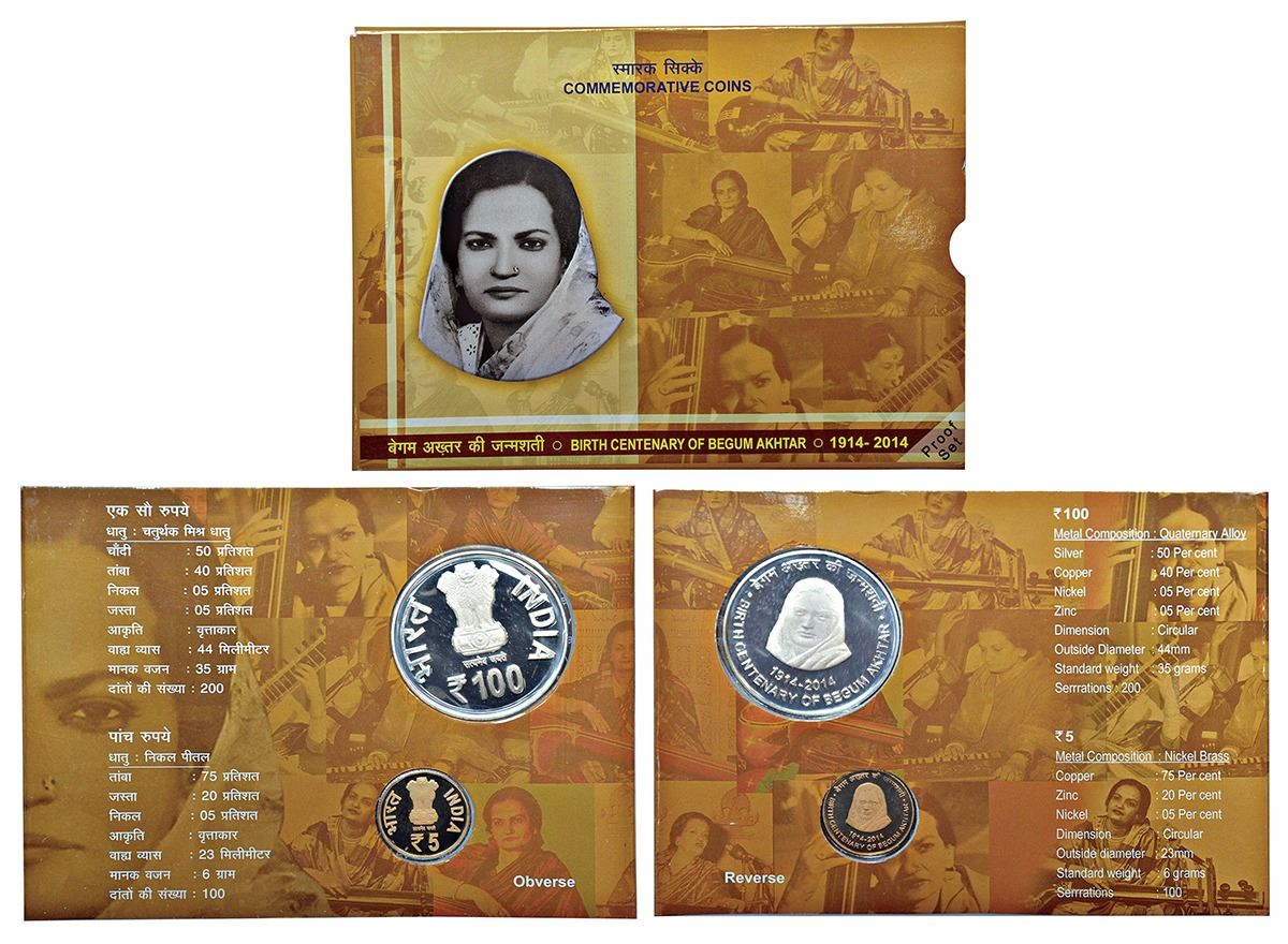 2014, Begum Akhtar Birth Centenary, Proof set of 2 coins, 100 rupees and 5 rupees, Kolkata mint, in original mint packing.