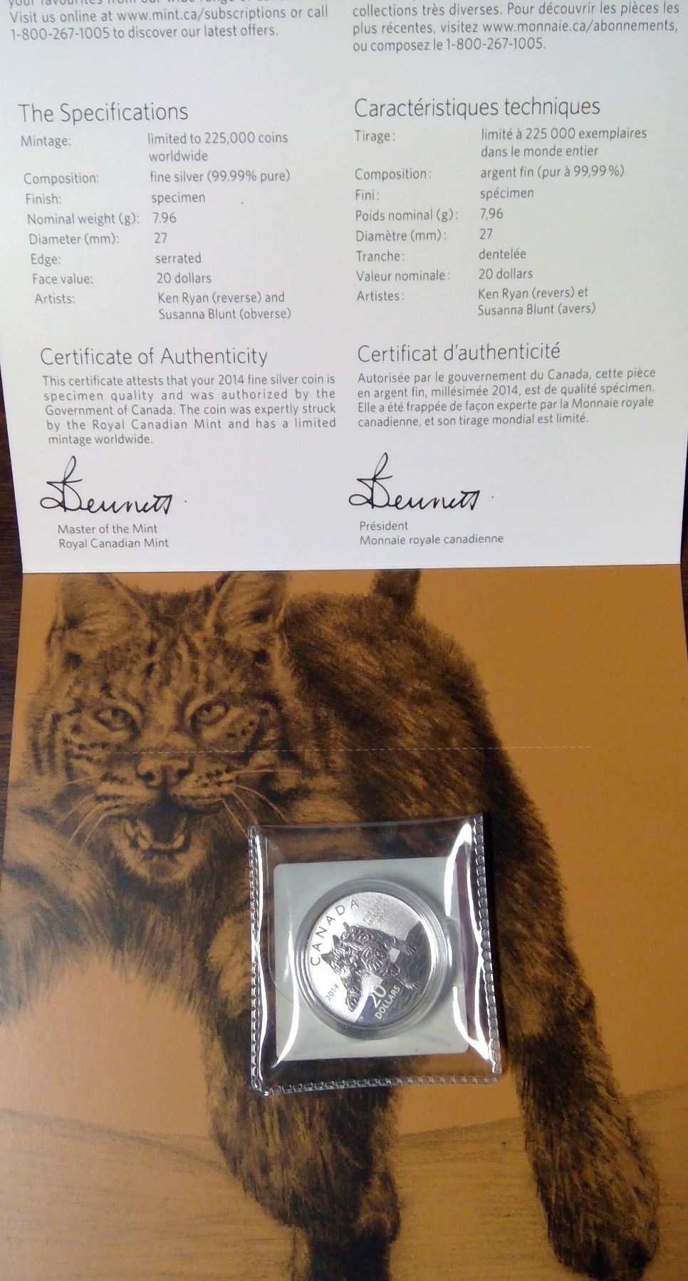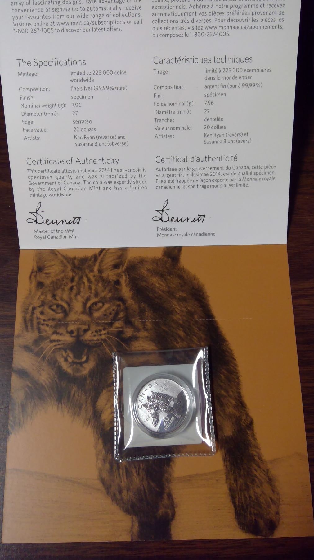 2014 Bobcat $20. .9999 pure silver. In folder of issue.